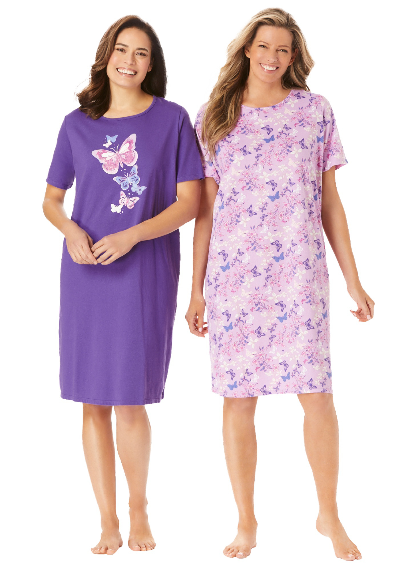 Plus Size Women's 2-Pack Short-Sleeve Sleepshirt by Dreams & Co. in Plum Burst Floral Butterfly (Size 1X/2X) Nightgown