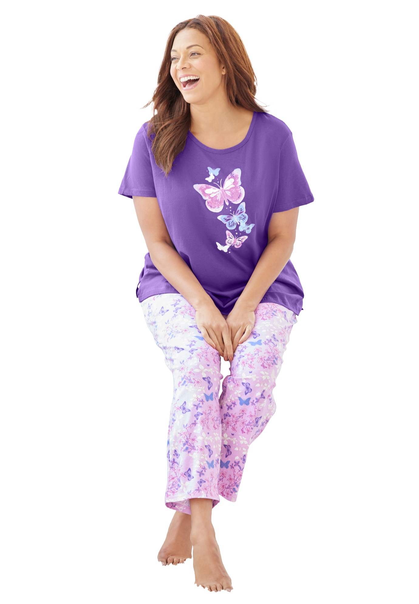Plus Size Women's Graphic Tee PJ Set by Dreams & Co. in Plum Burst Floral Butterfly (Size 5X) Pajamas
