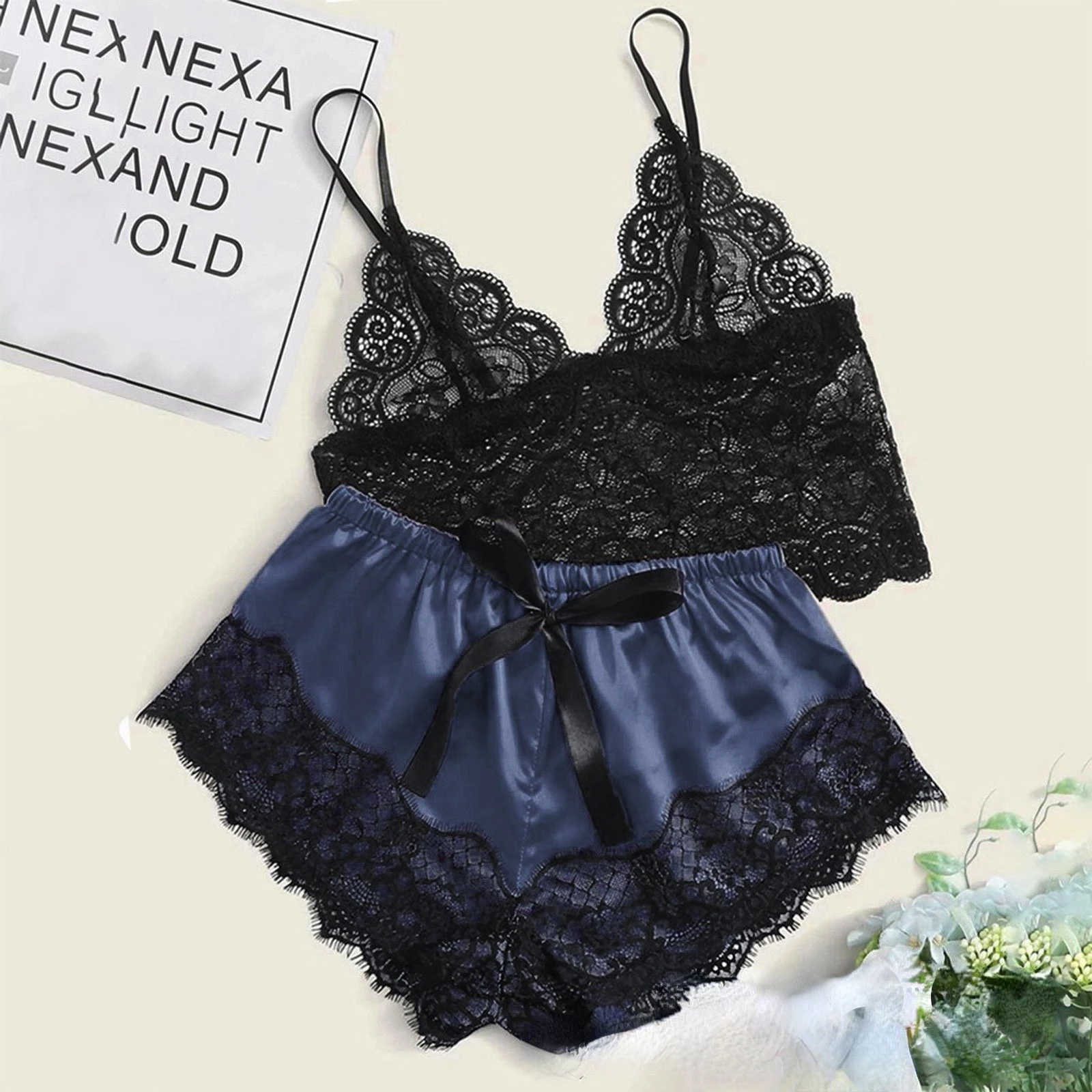 Lace Pajama Set, Sexy Sleepwear For Women, Top Shorts Lingerie, Comfortable Underwear Pajama Set black l