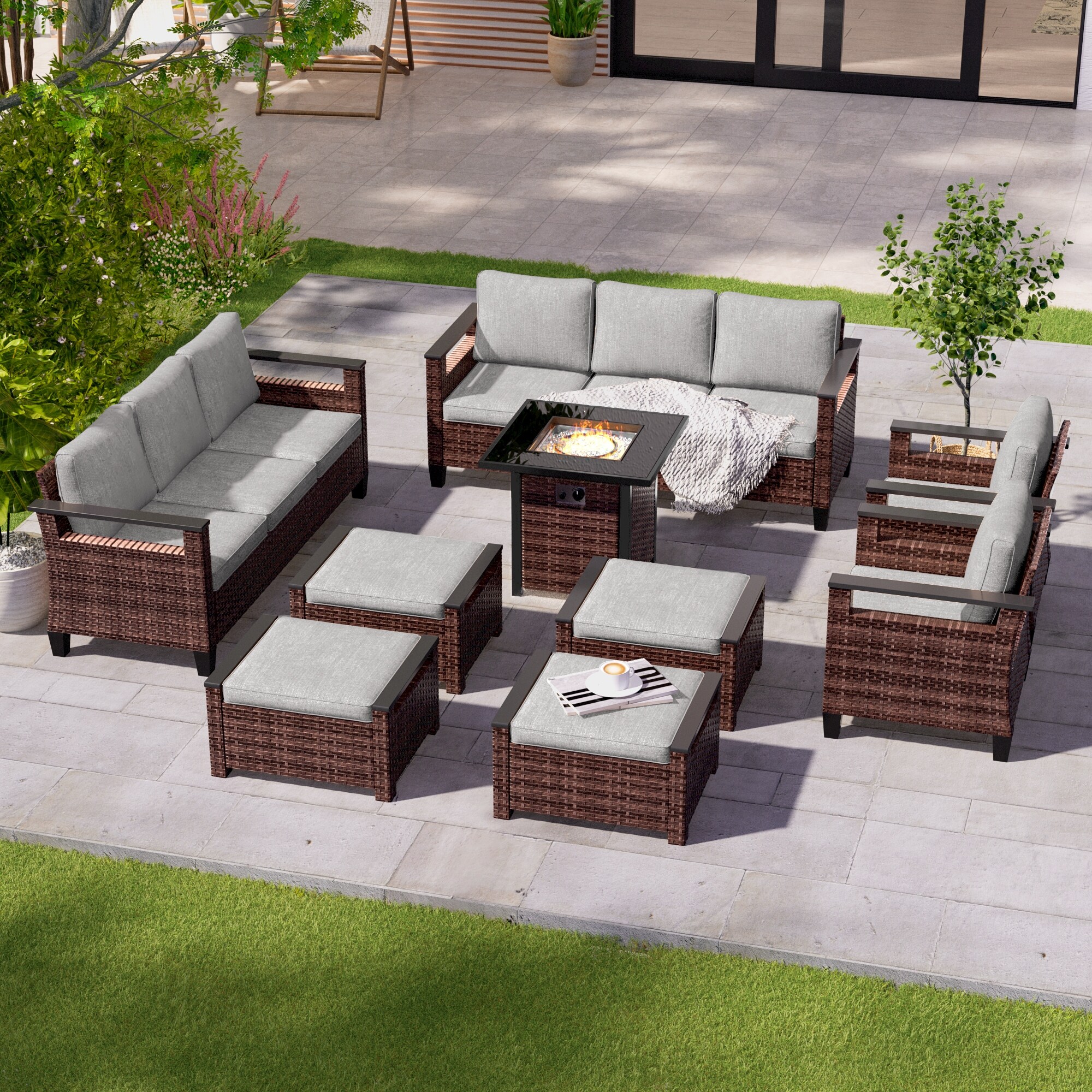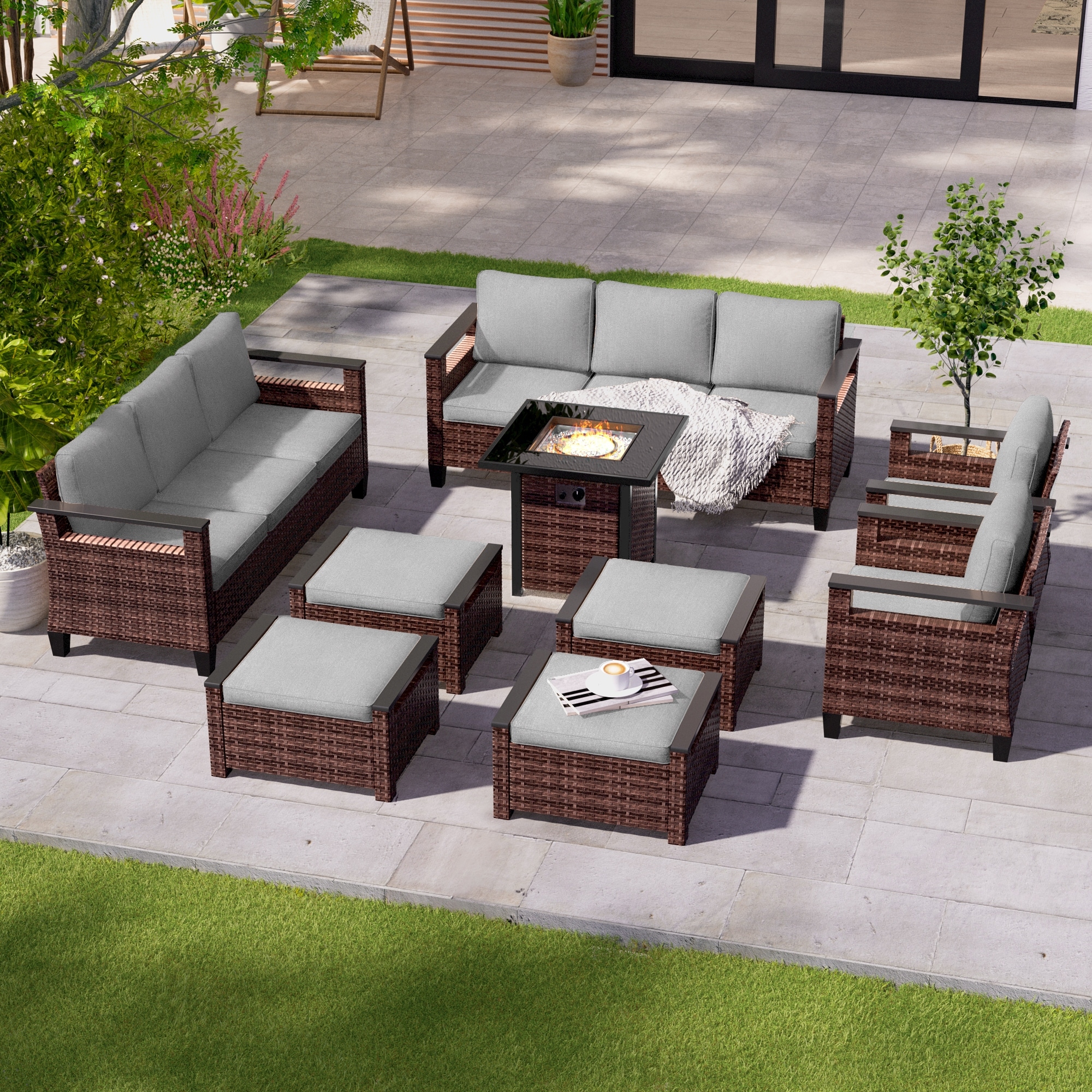 Livoosun 9 Pieces Patio Sofa with Square Fire Pit Table and Ottomans, All-Weather PE Rattan Wicker Sofa with Cushion, Gray