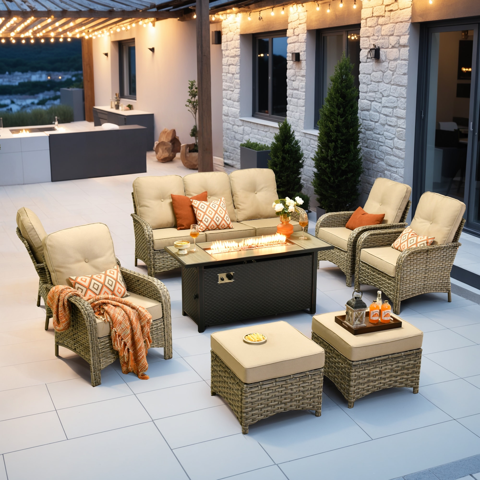 OVIOS 8-piece Patio Wicker Conversation Furniture Set With Fire Pit