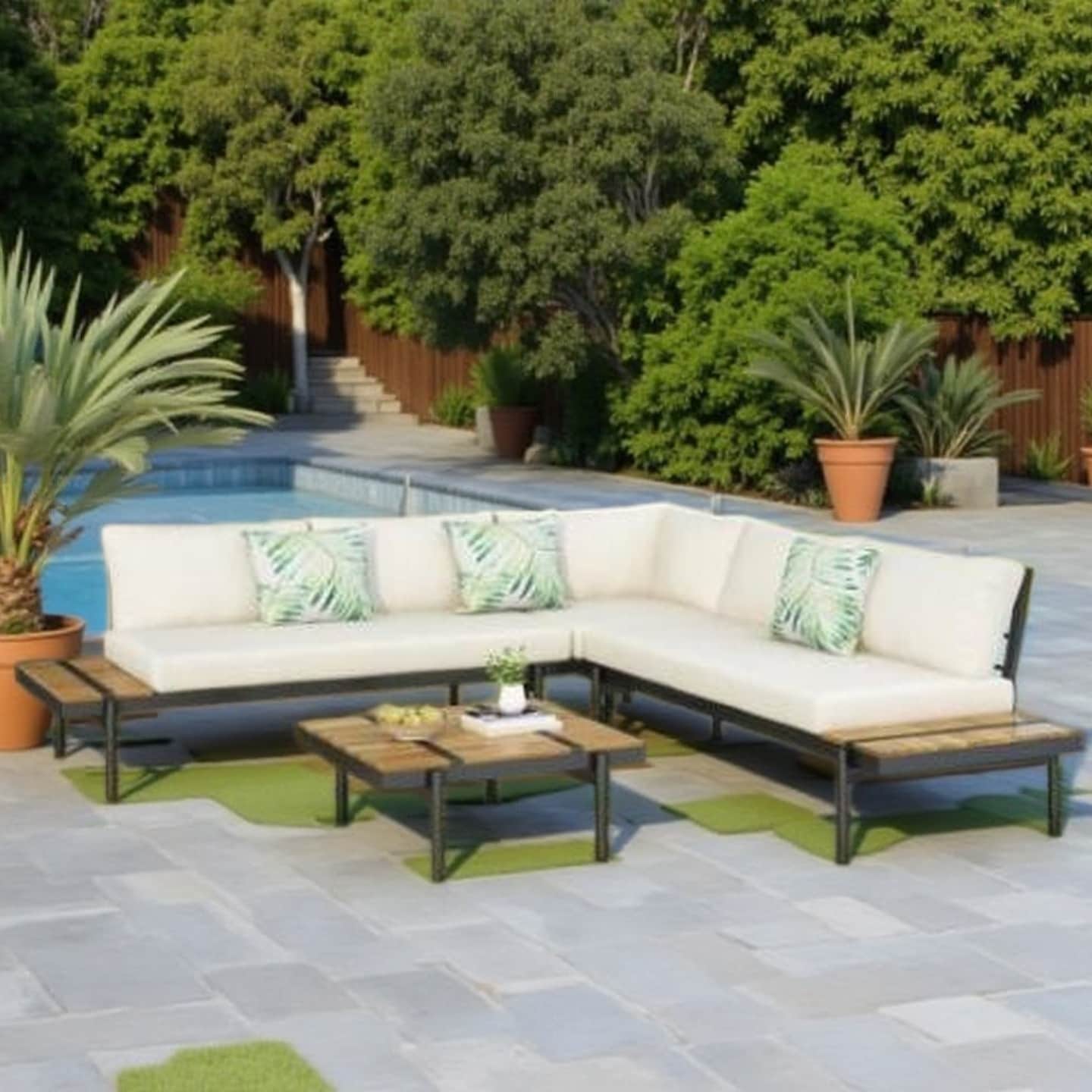 Theo 5-Piece Outdoor Sectional Sofa with Cream Cushions, Acacia Wood Accents & Iron Frame, Modern Patio Seating