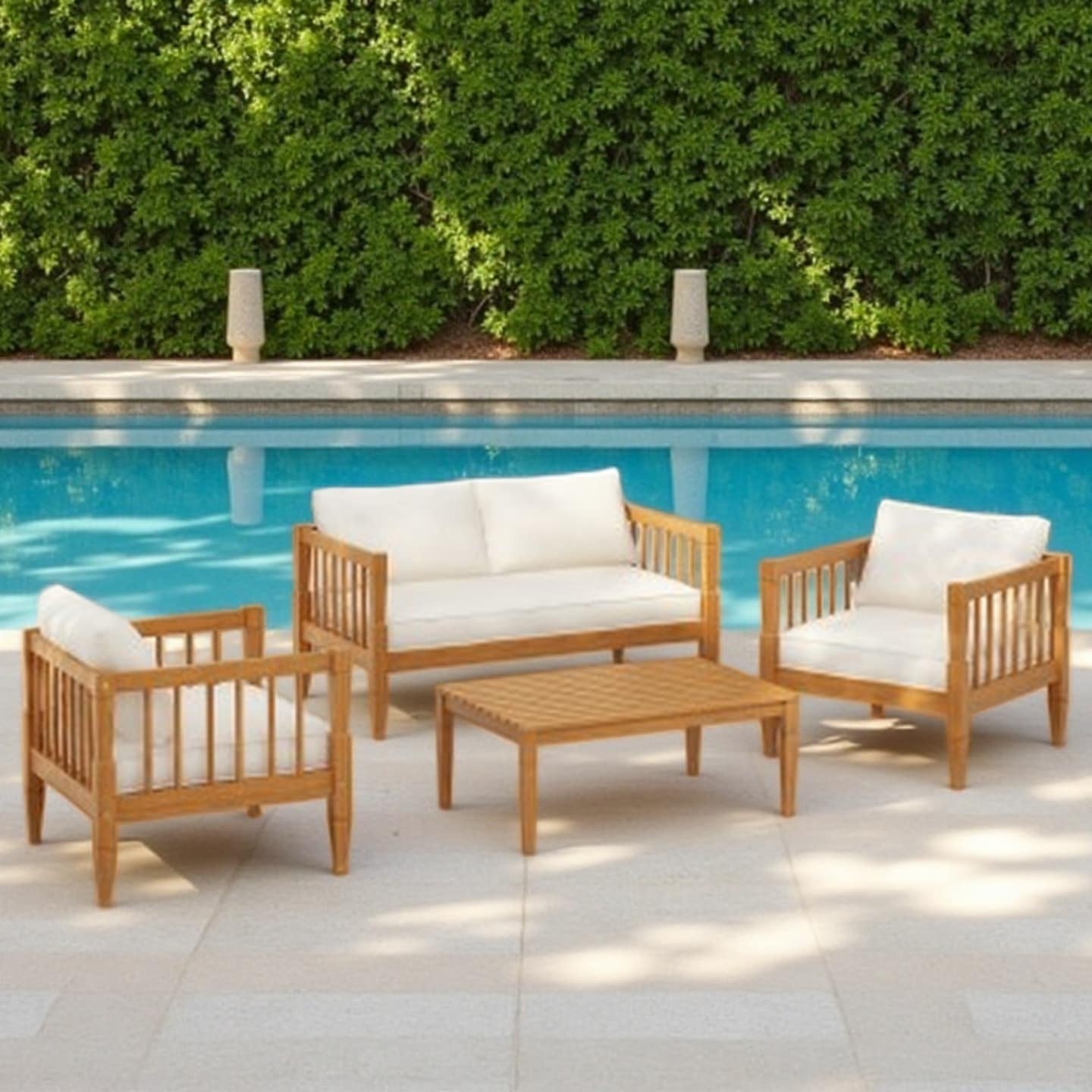 4-Piece Acacia Wood Outdoor Patio Sofa Set with Loveseat, Two Club Chairs, Coffee Table & Thick Beige Cushions