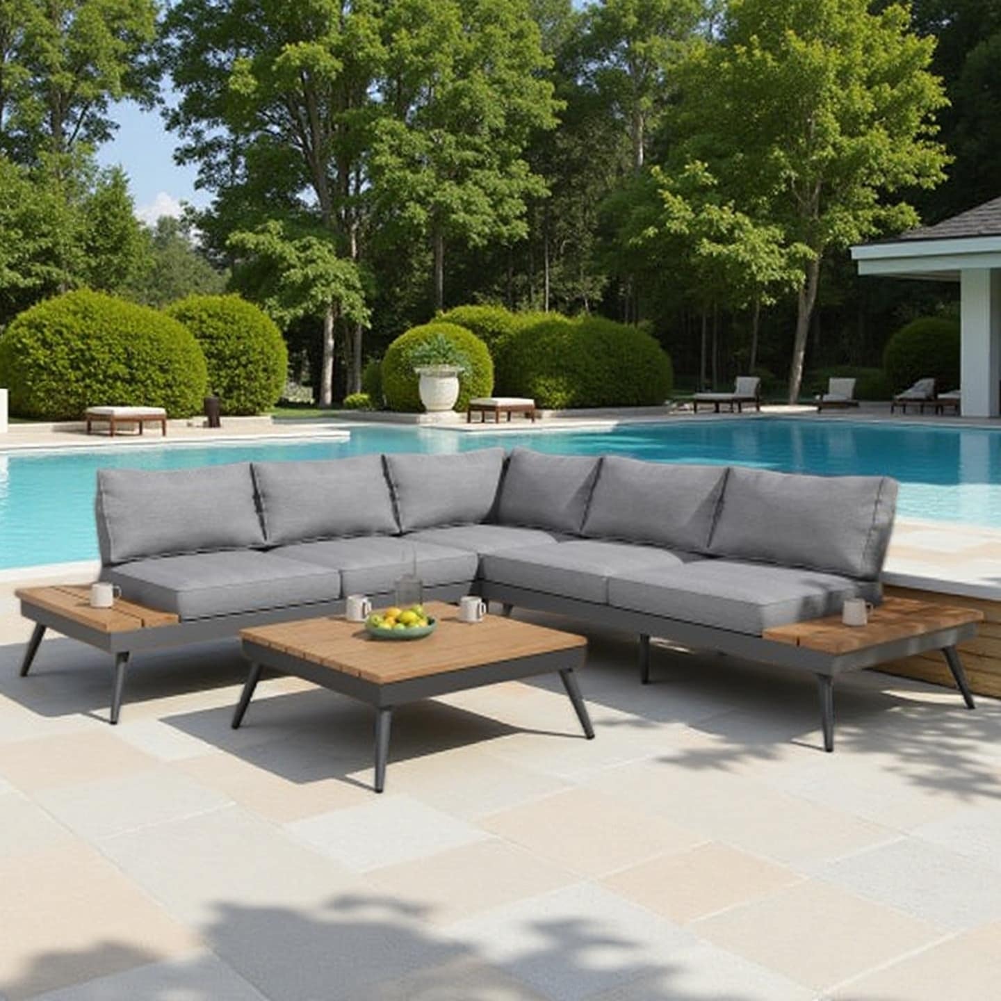 4-Person Outdoor Sectional Sofa Set with Faux Wood Accents, Aluminum Frame, Mesh Backrests, and Water-Resistant Cushions