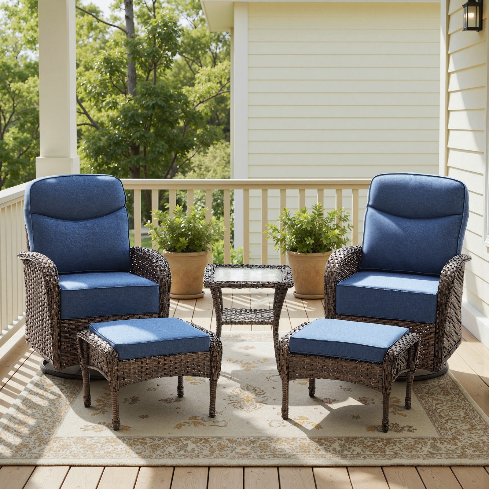 Gymojoy 5-Piece Outdoor Wicker Patio Set with 2 Swivel Glider Chairs, Side Table & 2 Ottomans, 6" Cushions