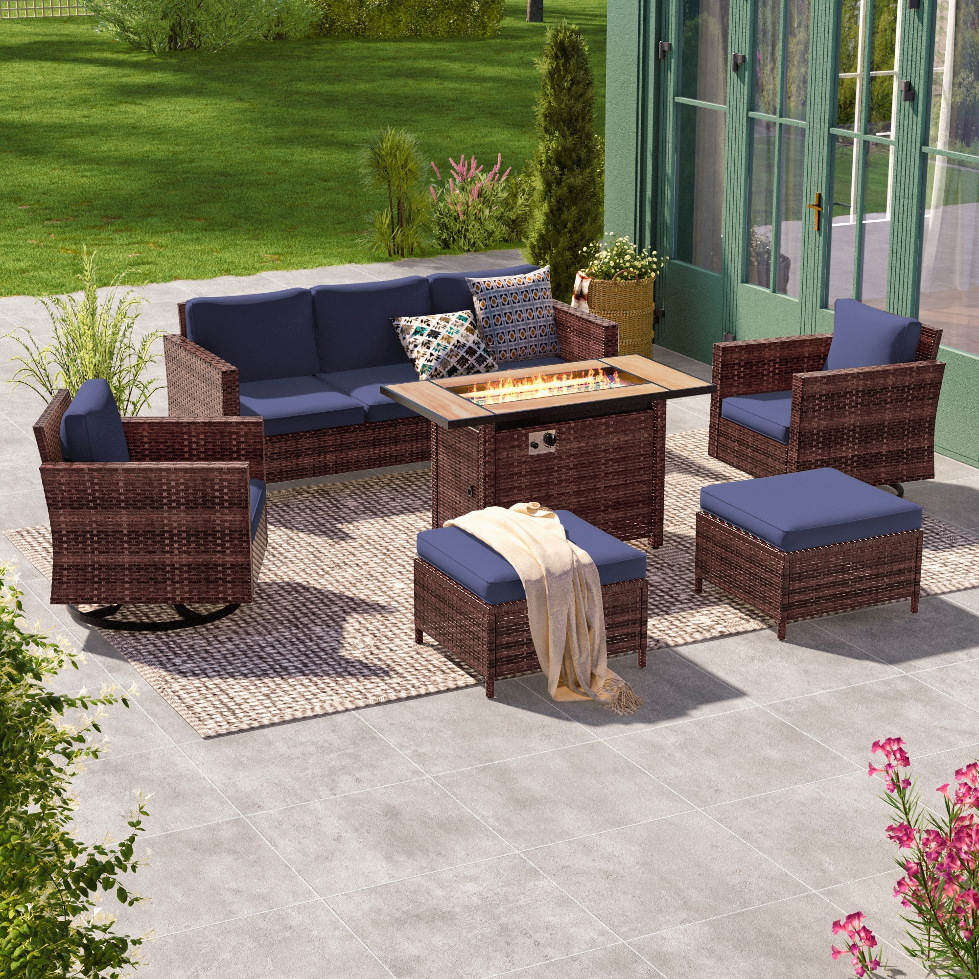 Livoosun 6 Pieces Patio Sofa with 45'' Fire Table Set, PE Wicker, Wide Armrests High Back Sofa Swivel Rocking Chairs