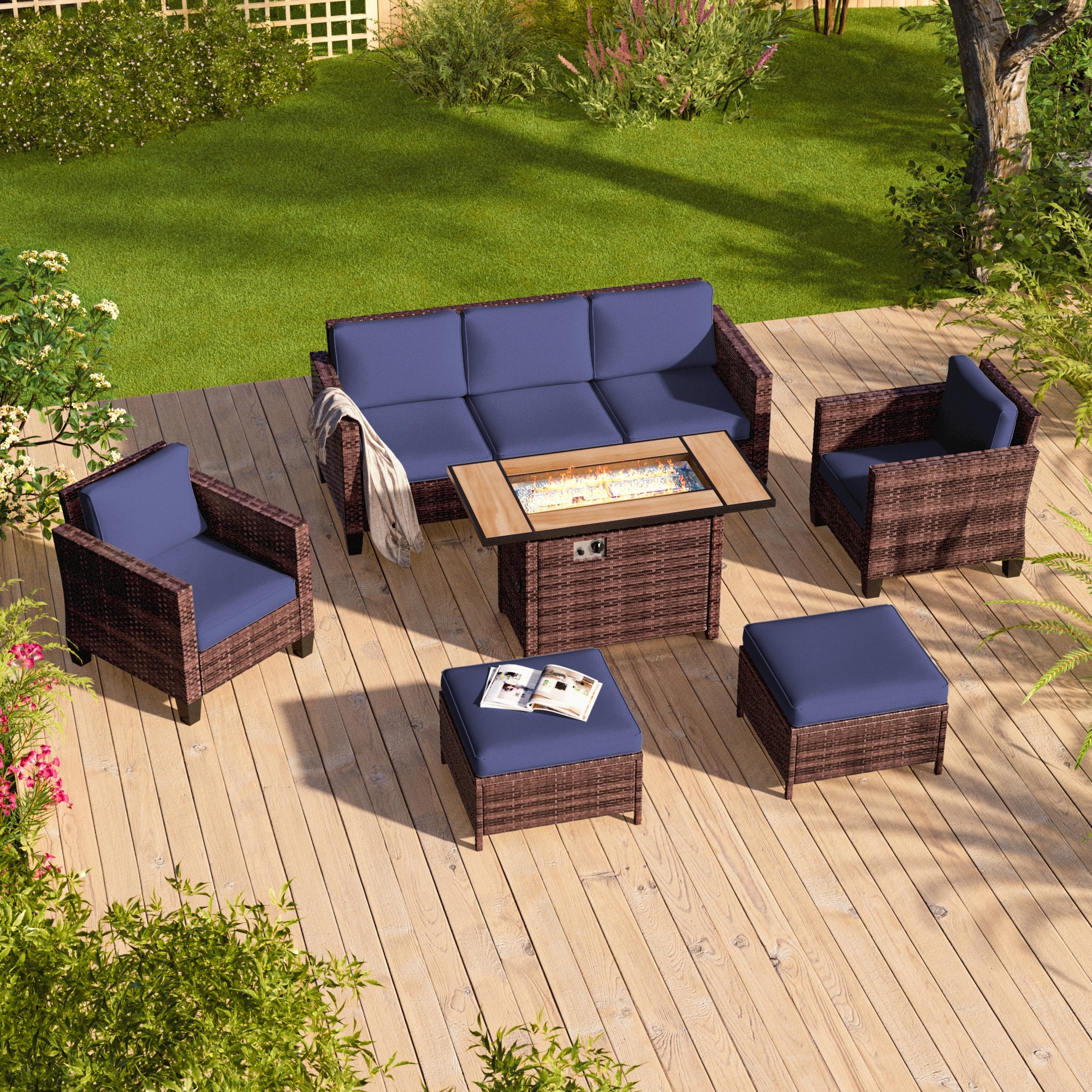 Livoosun 6 Pieces Patio Sofa with 45'' Fire Table Set, PE Wicker, Wide Armrests High Back Sofa Chair Design for Lawn, Patio
