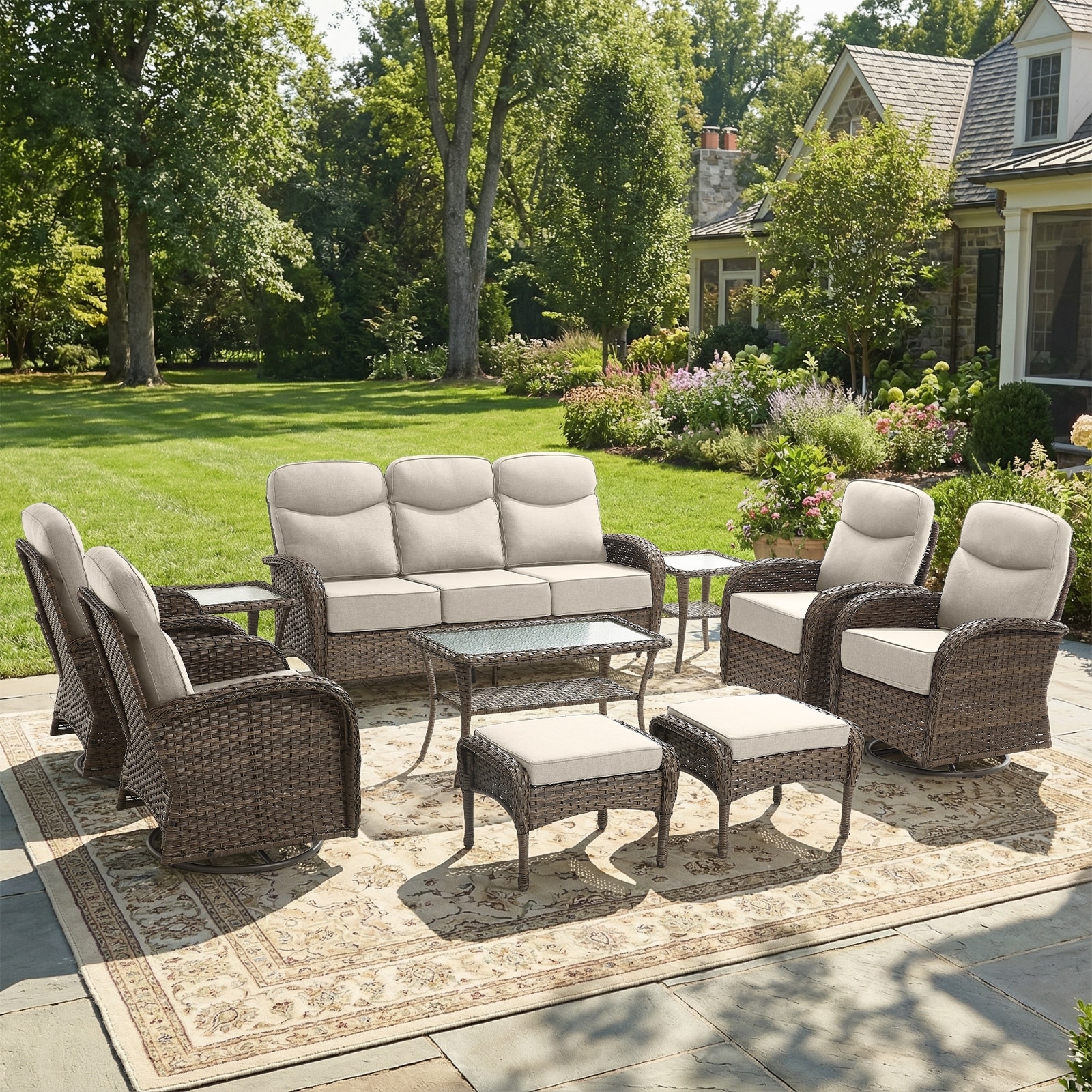 Pocassy Outdoor 10-Piece Sofa Swivel Chair Ottoman with Table