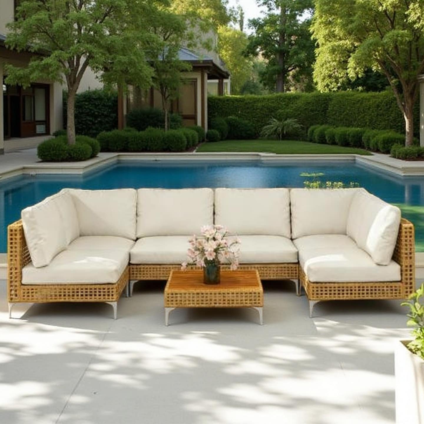 7 Piece Modular Outdoor Patio Sectional Sofa Set with Acacia Wood Coffee Table and Thick Cushions