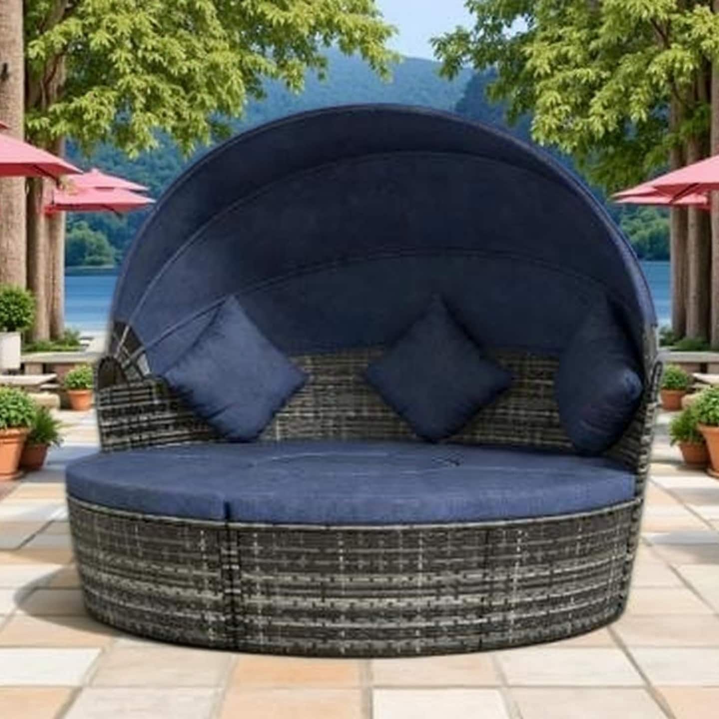 4-Piece Convertible Outdoor Rattan Lounge Set with Retractable Canopy, Round Daybed, Cushioned Sofa & Ottoman