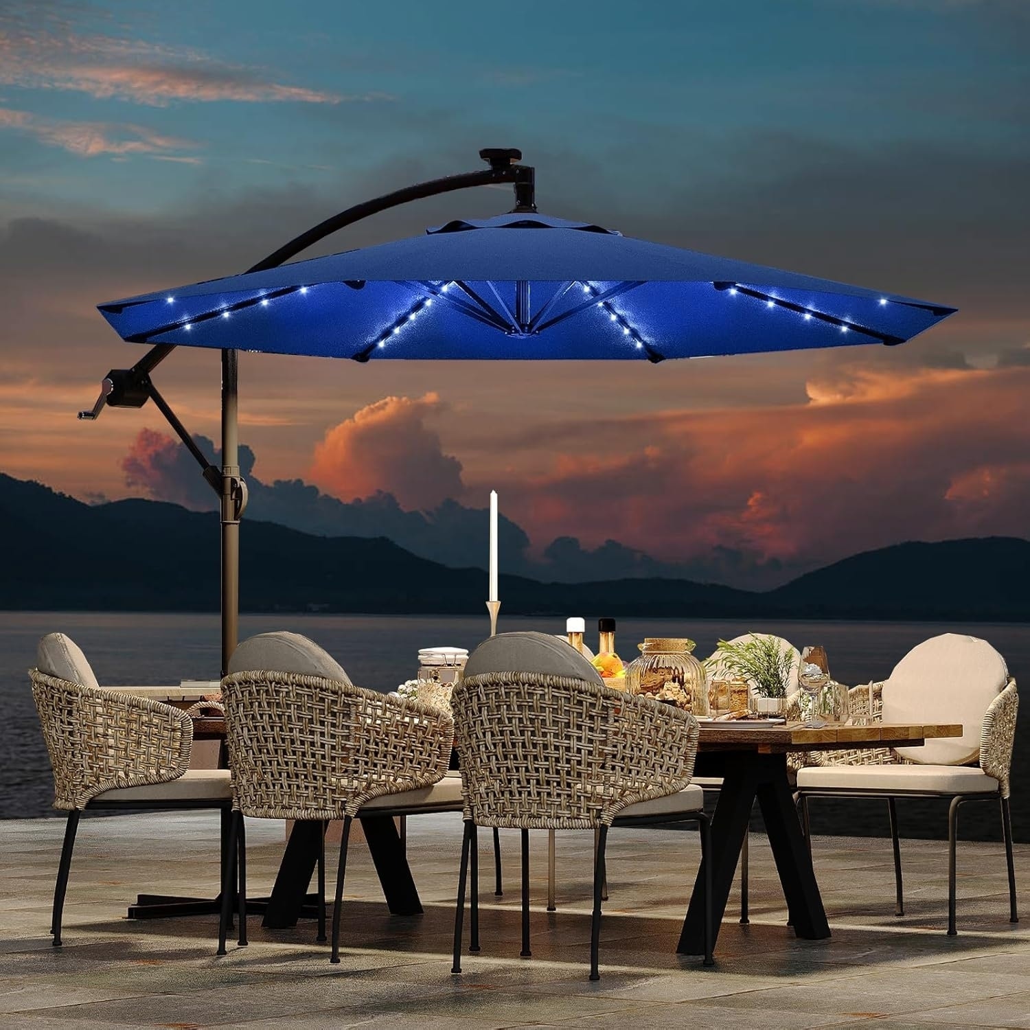 10FT Offset Solar Patio Umbrella 32 LED Lights Infinite Tilt Cross Base Navy
