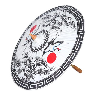 'Traditional Crane-Themed Cotton and Bamboo Parasol in White'