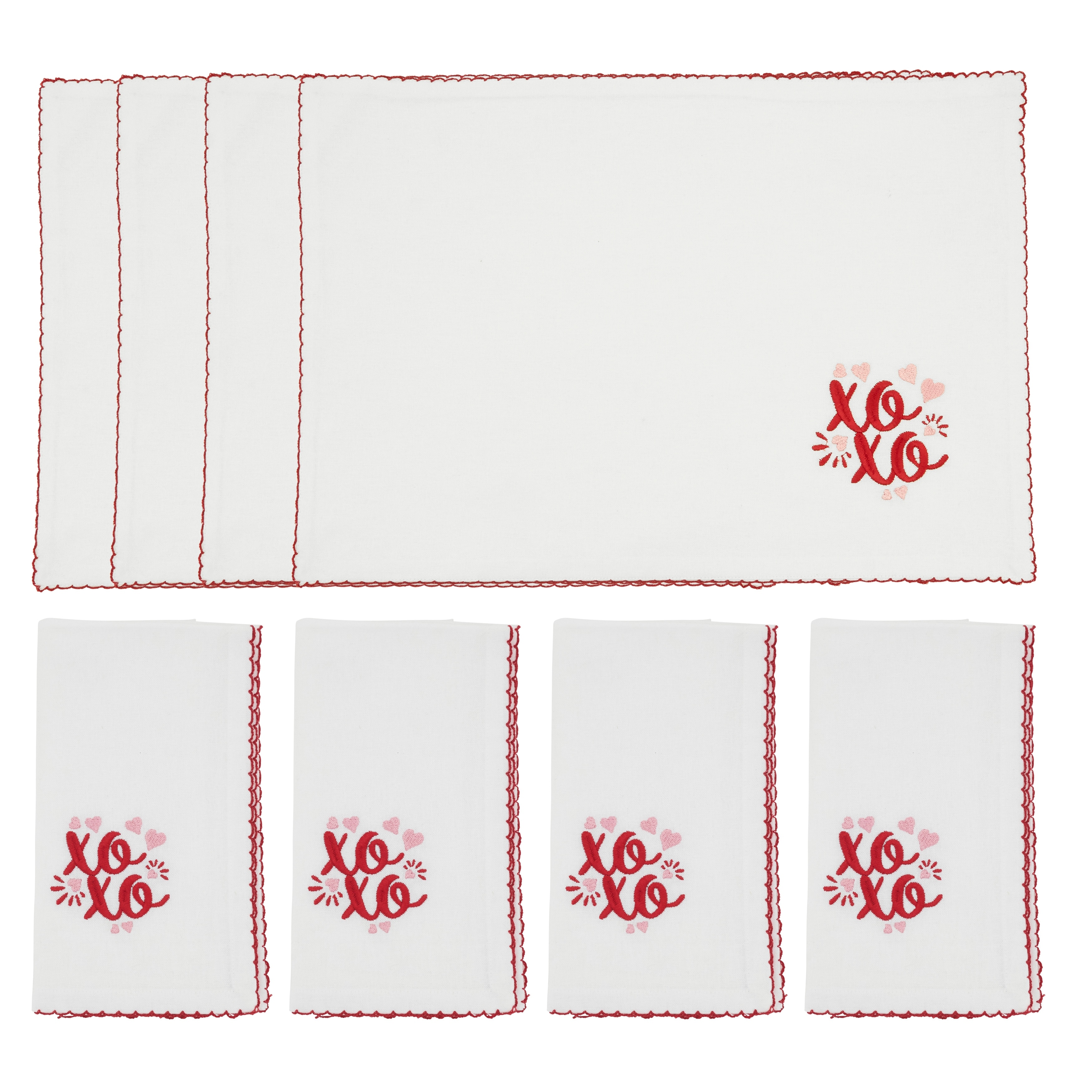 XO Placemats & Napkins (Set of 8) - Embroidered Valentine's Table Linens with Scalloped Red Trim, 13"x19" / 18"x18"