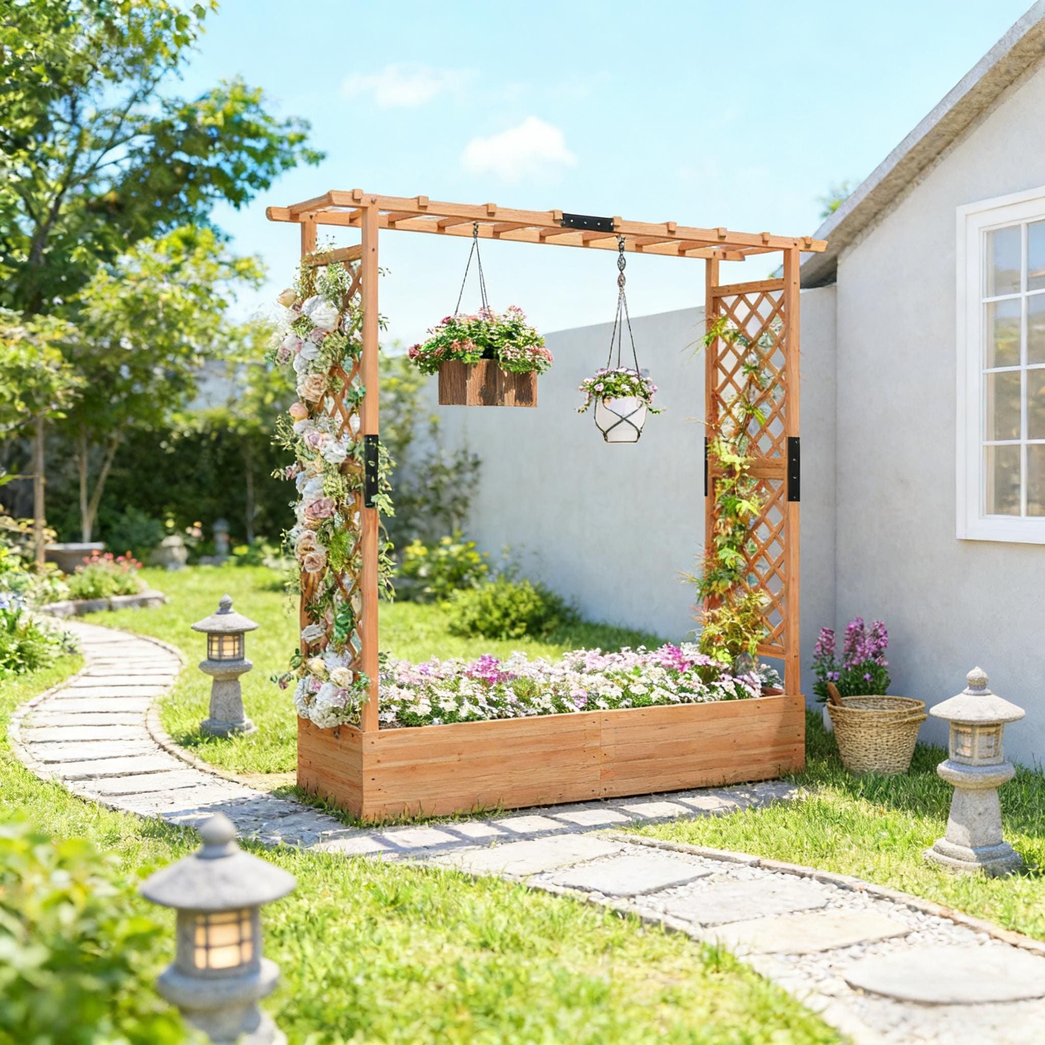Raised Garden Planter with Trellis and Drainage for Flowers Vegetables