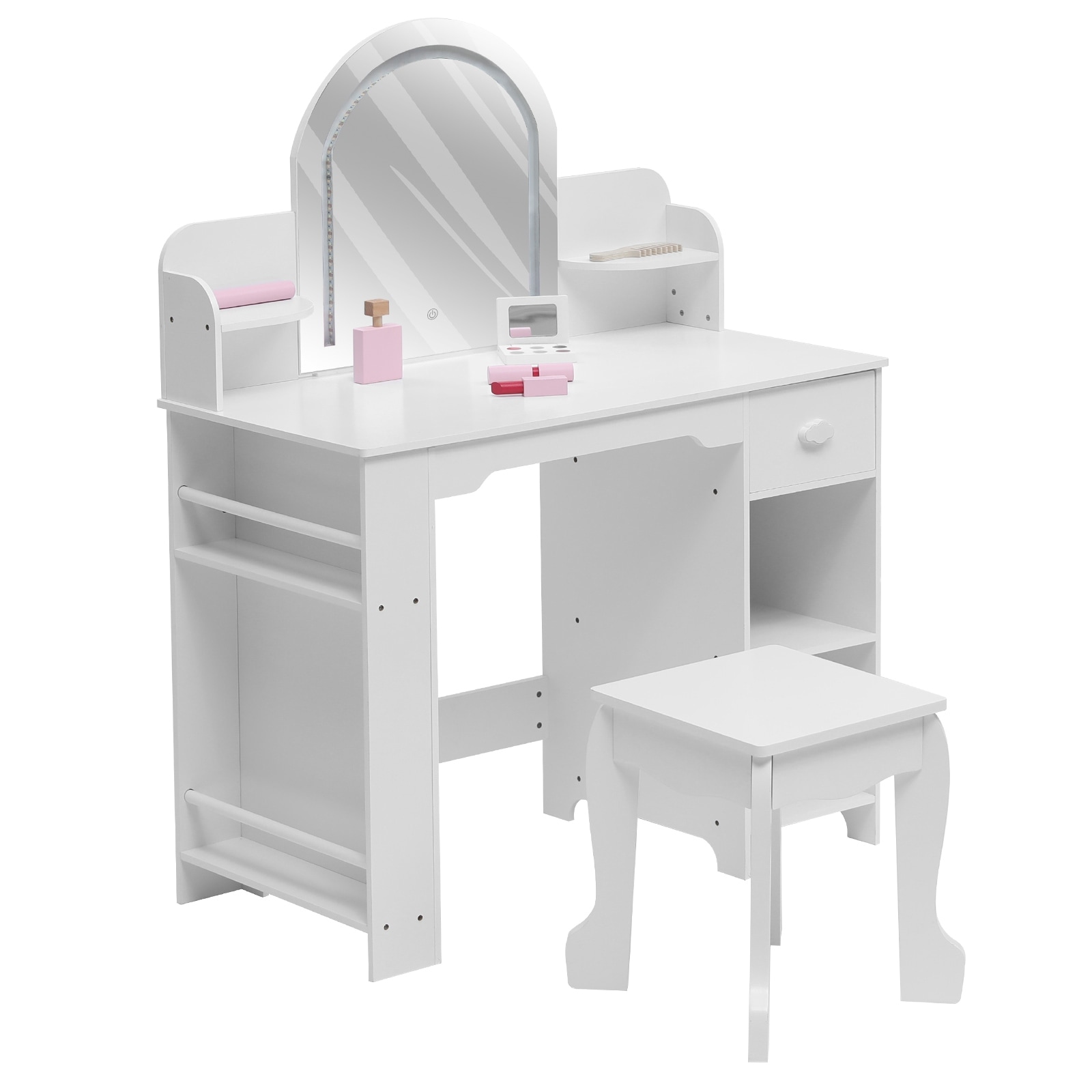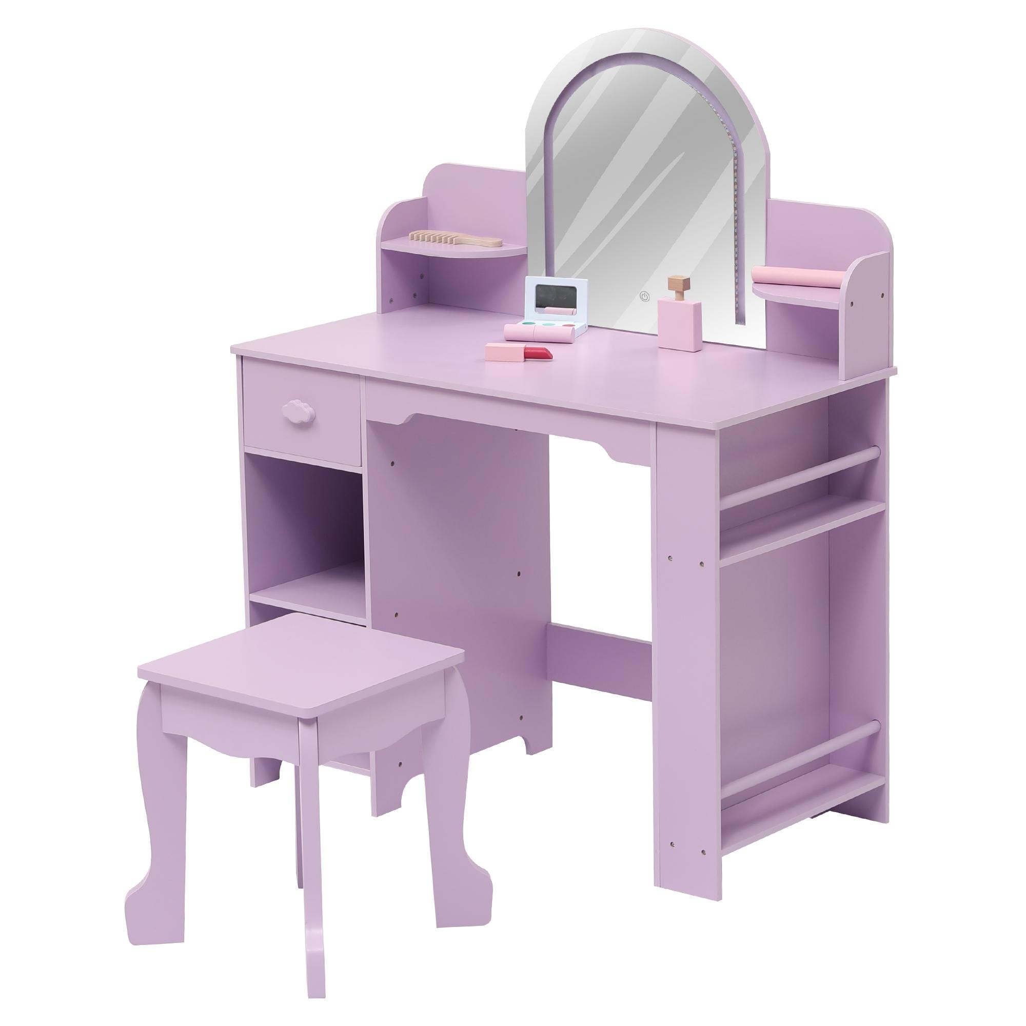 Kids Vanity Table and Stool Set with Mirror, 2-in-1 Makeup Desk for Girls Ages 3-9, Wooden Dressing Table