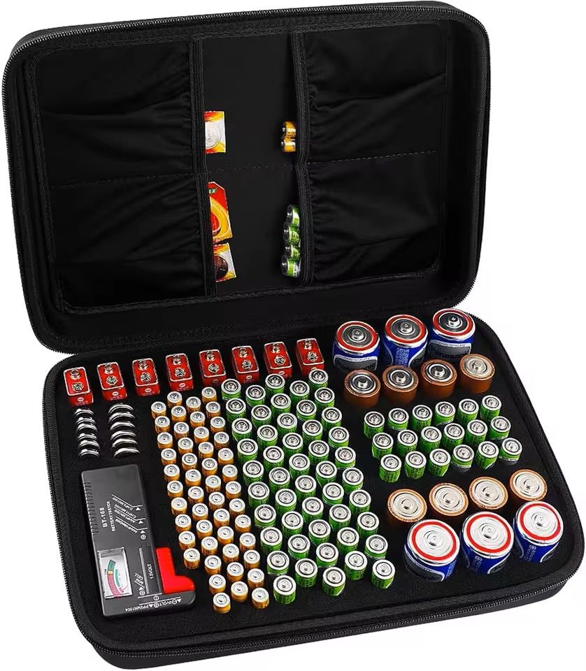 Battery Storage Organizer Case With Tester Compact Battery Holder For AA, AAA, C, D, 9V & Button Cells allblack