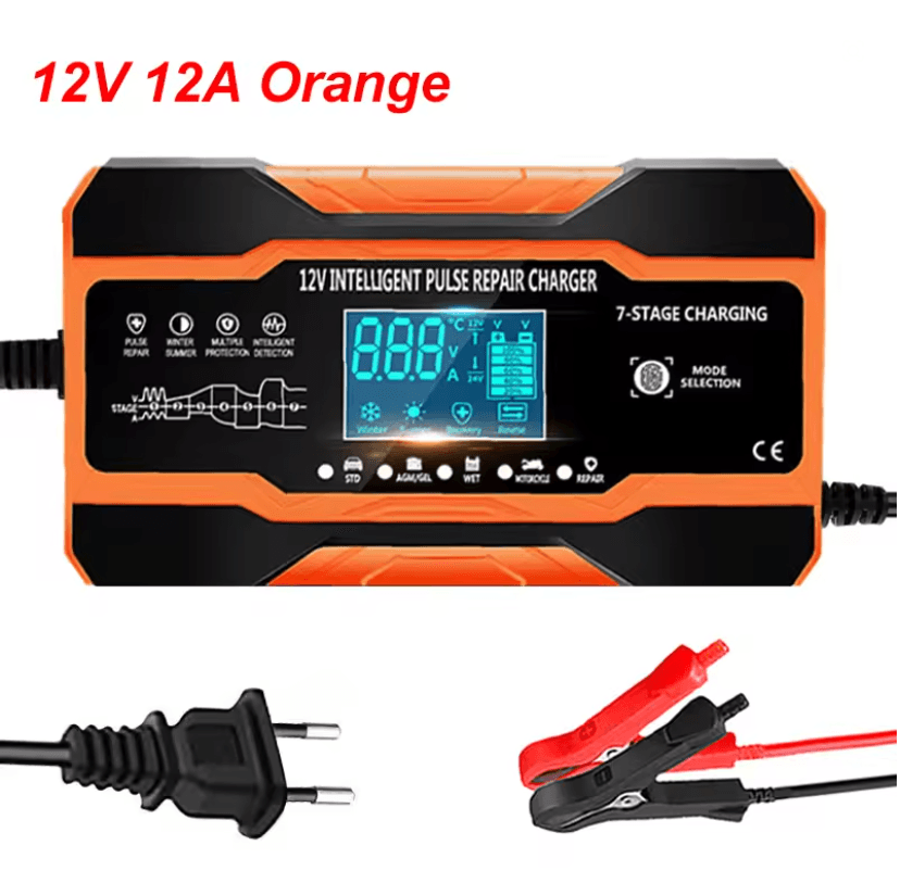 Smart 12V 24V Battery Charger With Pulse Repair For Car AGM GEL And Lead Acid Batteries 12v 12a Orange