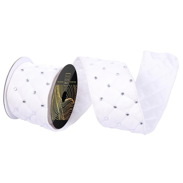 Vickerman 799543 - 4"x5yd White Velvet Quilt Silver Jewel (QK254611) White Colored Christmas Ribbons