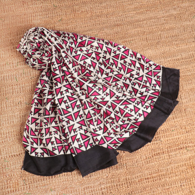 'Hand-Woven and Block-Printed Silk Shawl with Geometric Theme'
