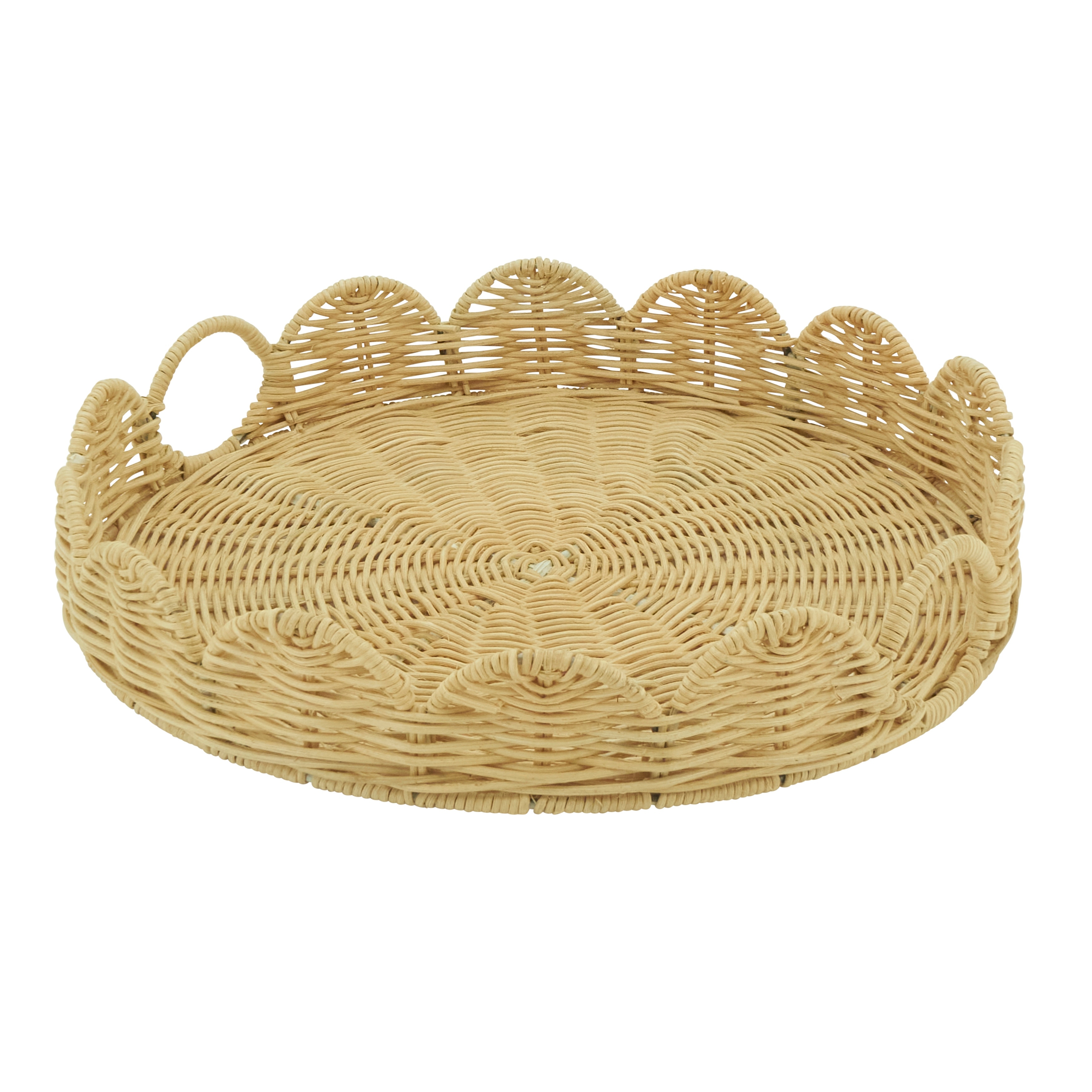 Round Scalloped Rattan Serving Tray with Handles - Handwoven Natural Wicker Decorative Tray for Coffee Table, 14"x3"