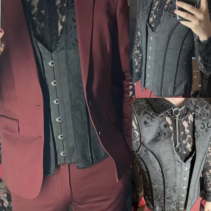 Elegant Renaissance Mens Waist Cincher Steel Boned Medieval Corset Vest For Stomach Control blackblackprint m