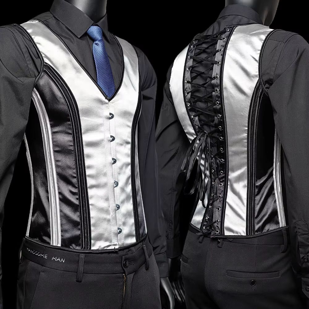 Elegant Renaissance Mens Waist Cincher Steel Boned Medieval Corset Vest For Stomach Control grey Black m