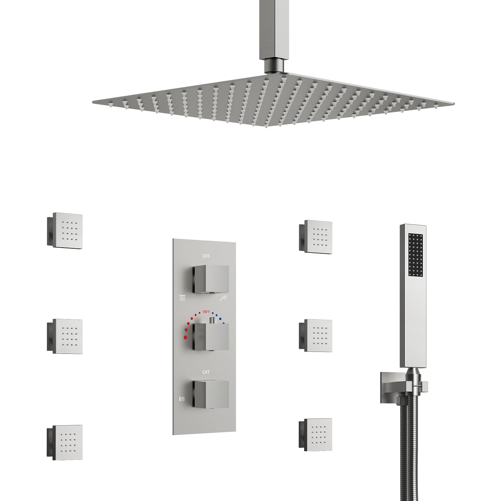Thermostatic 3-Spray 12 in. Wall Mount Fixed and Handheld Dual Shower Head 2.5 GPM with 6-Body Jets and Adjustable Slide Bar