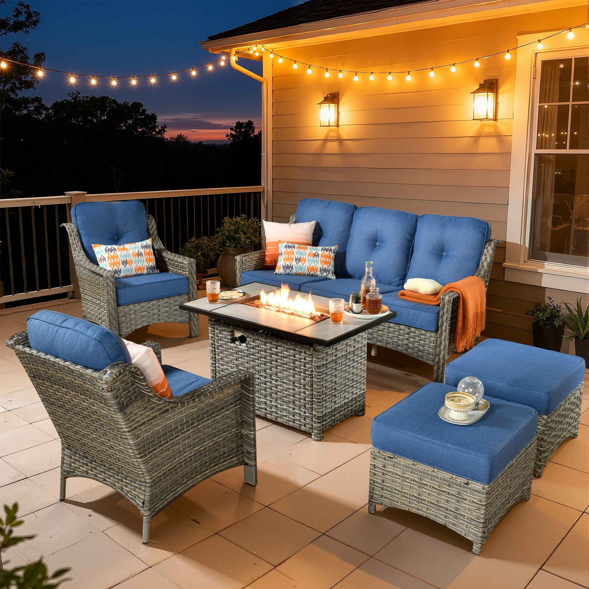 XIZZI 6-Piece Patio Furniture High-Back Wicker Sofa Set with 42" Fire Table
