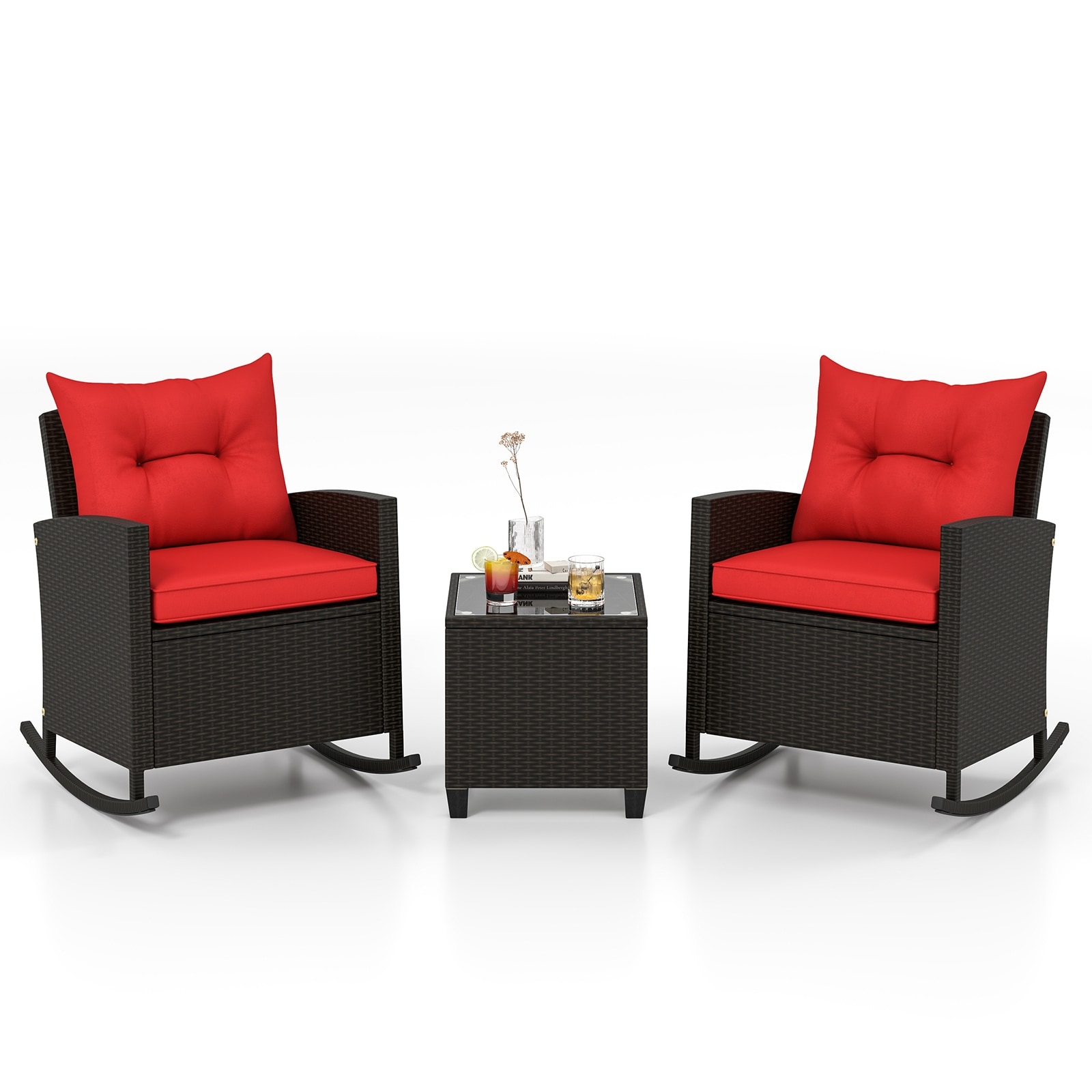 Gymax Set of 3 Wicker Rocking Set w/ Tempered Glass Table Patio