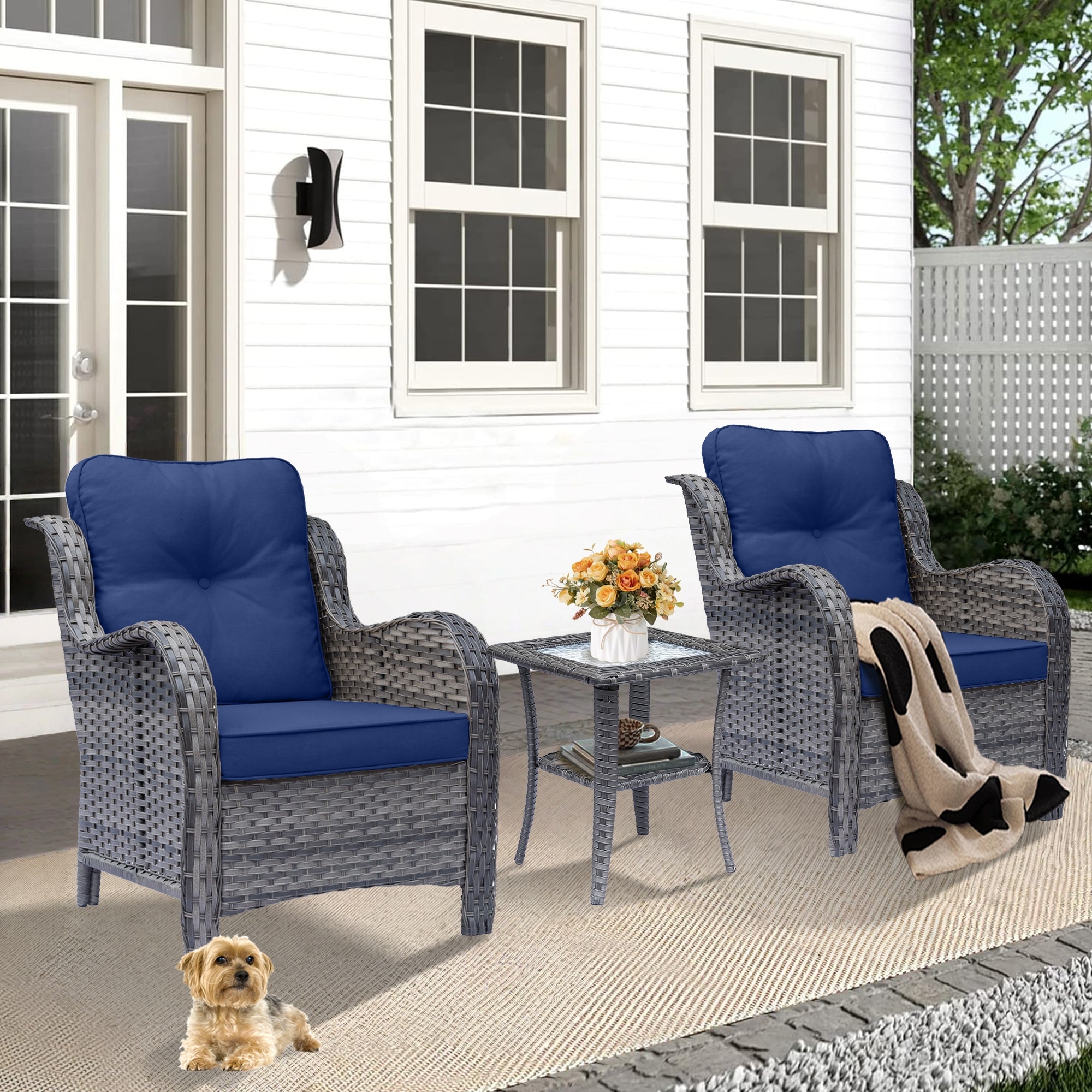 Outdoor 3-piece Cushioned Rattan Patio Furniture Conversation Set