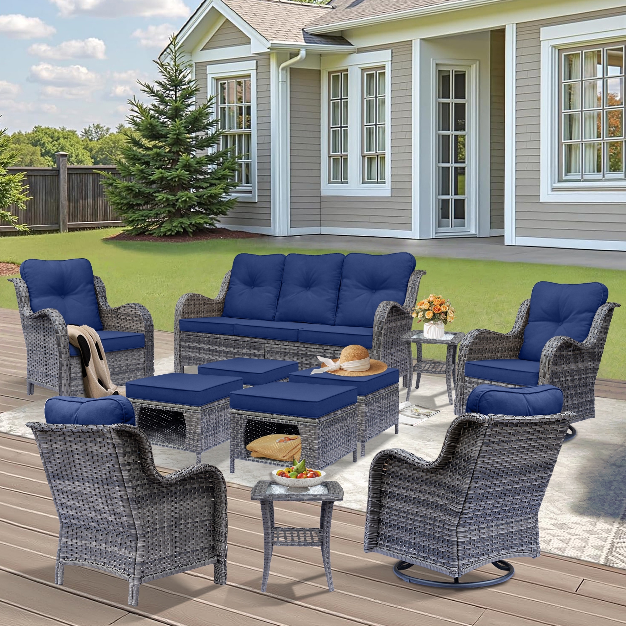 Gray Wicker Outdoor Patio Furniture Set with Swivel Rocker Patio Chairs