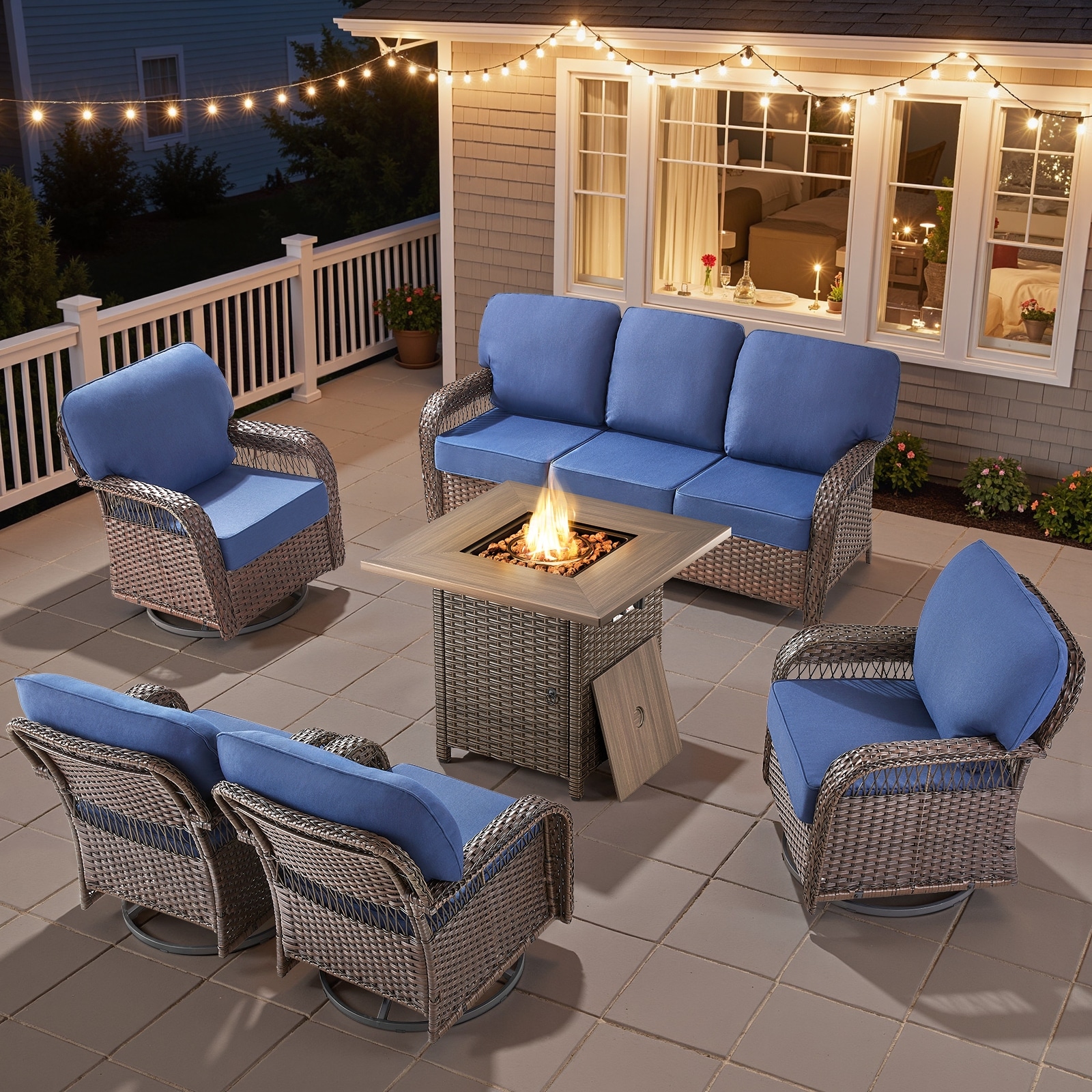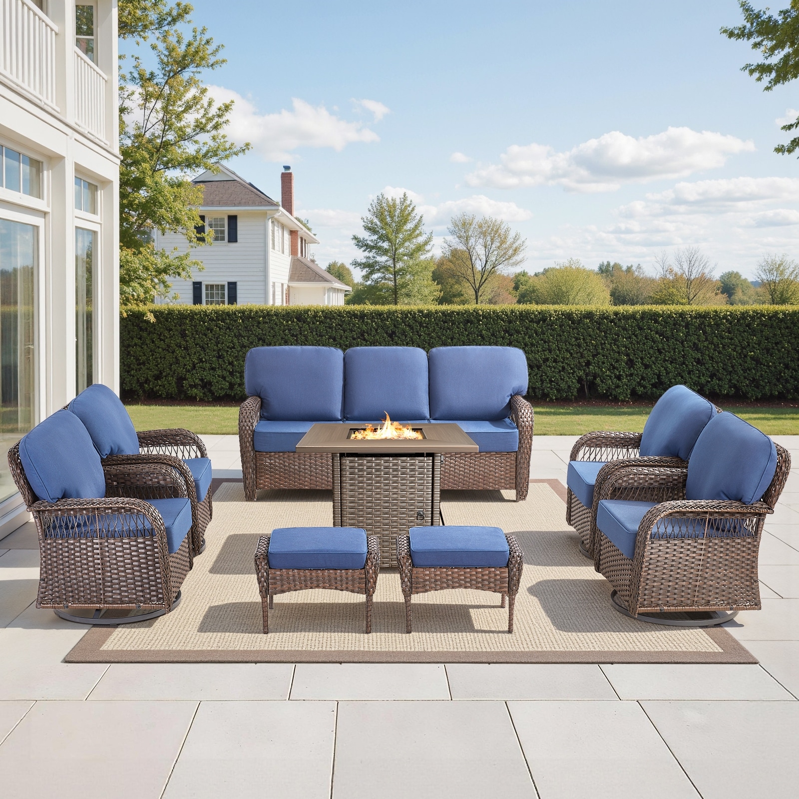 Pocassy Outdoor Sofa Ottoman Swivel Chair Table with Fire Table Set.