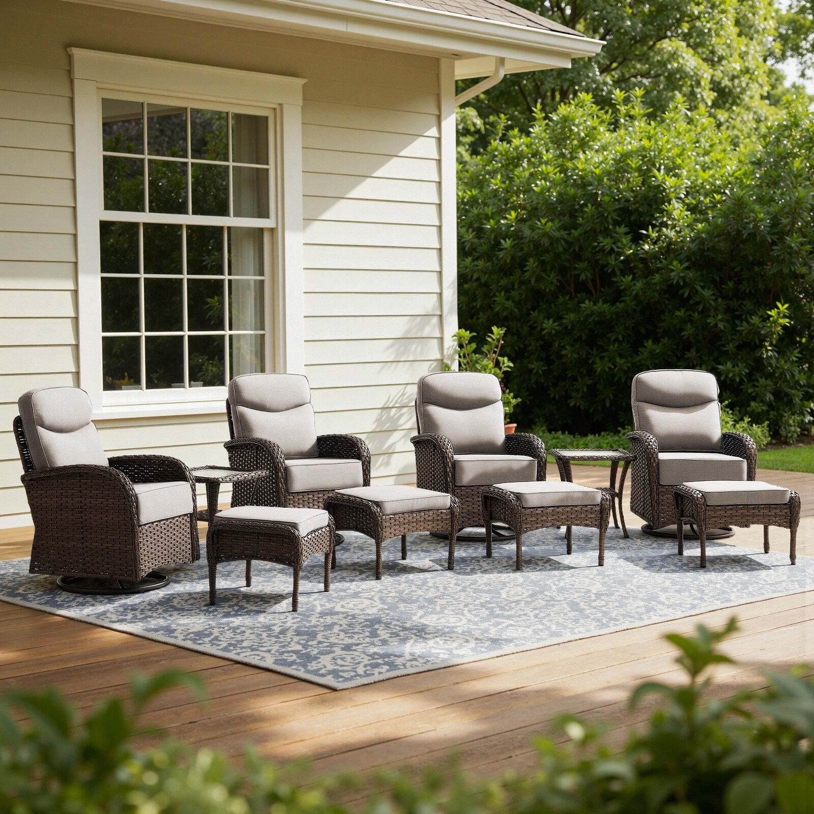 Gymojoy 8 - Person Outdoor Wicker Patio Set with 4 Swivel Glider Chairs, 2 Side Tables & 4 Ottomans, 6" Cushions