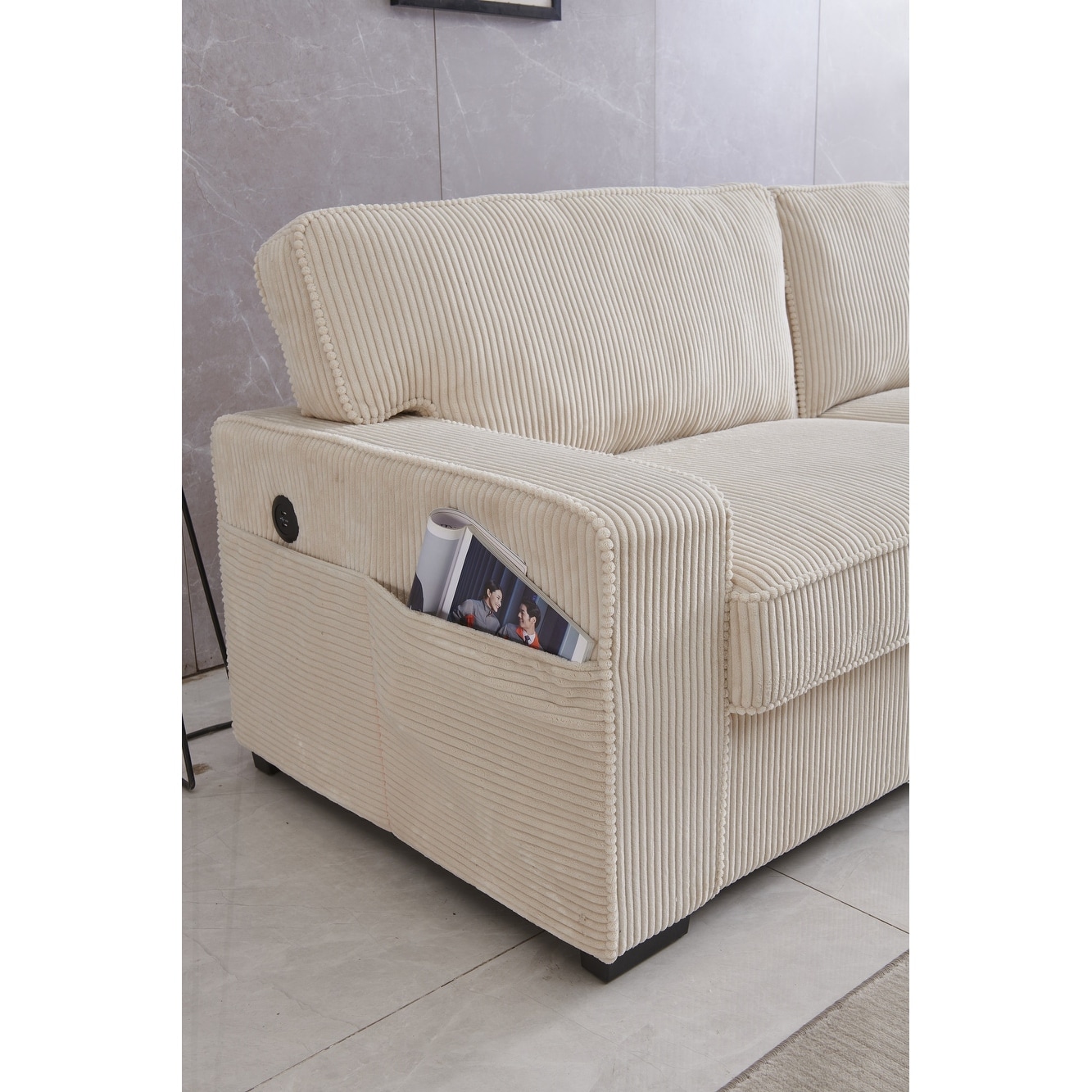 Modern L-shaped corduroy sectional sofa with storage space and ottoman