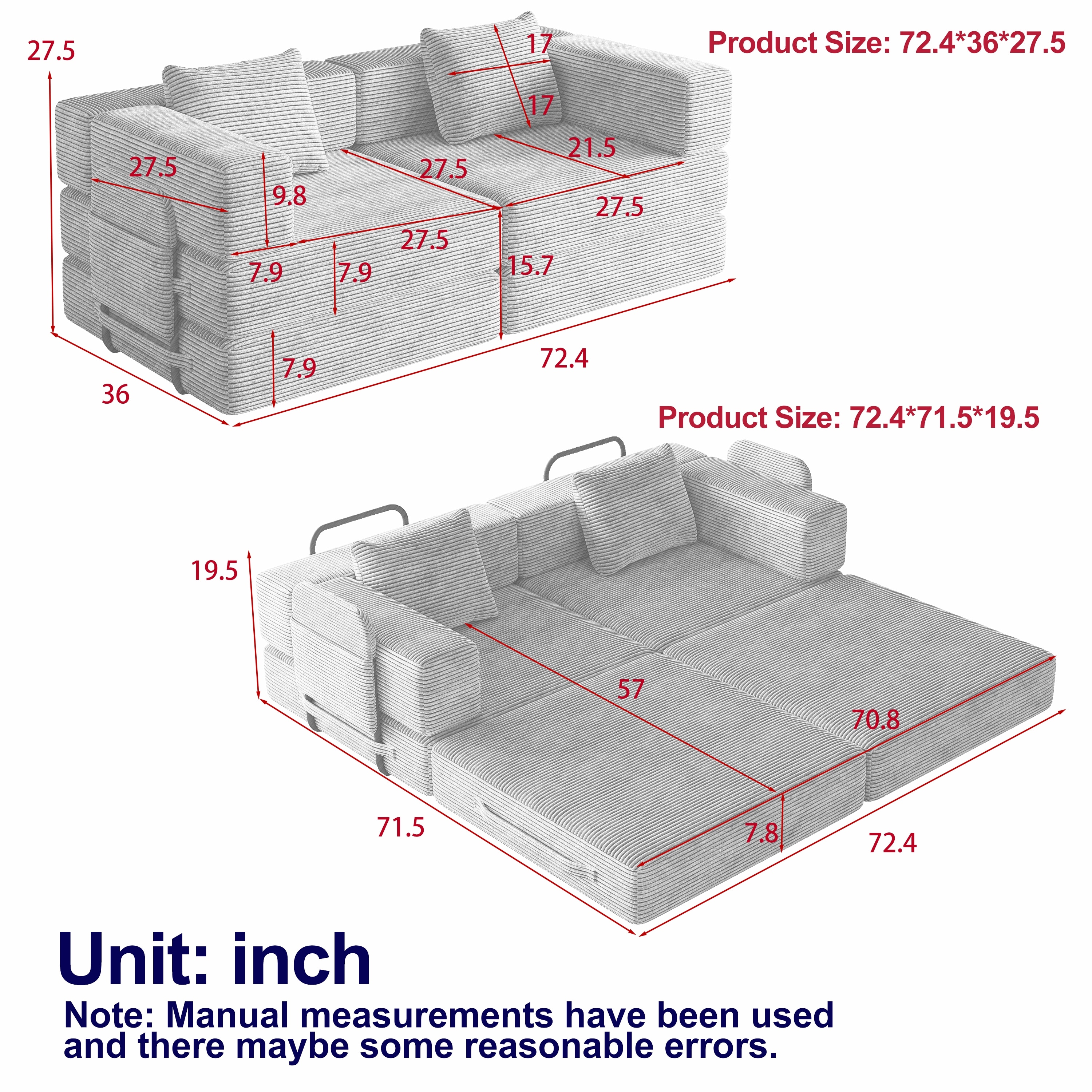 Convertible Sofa Bed, Corduroy Fabric Sofa With Side Storage Pockets And Cushions, Comfortable Folding Sofa Bed