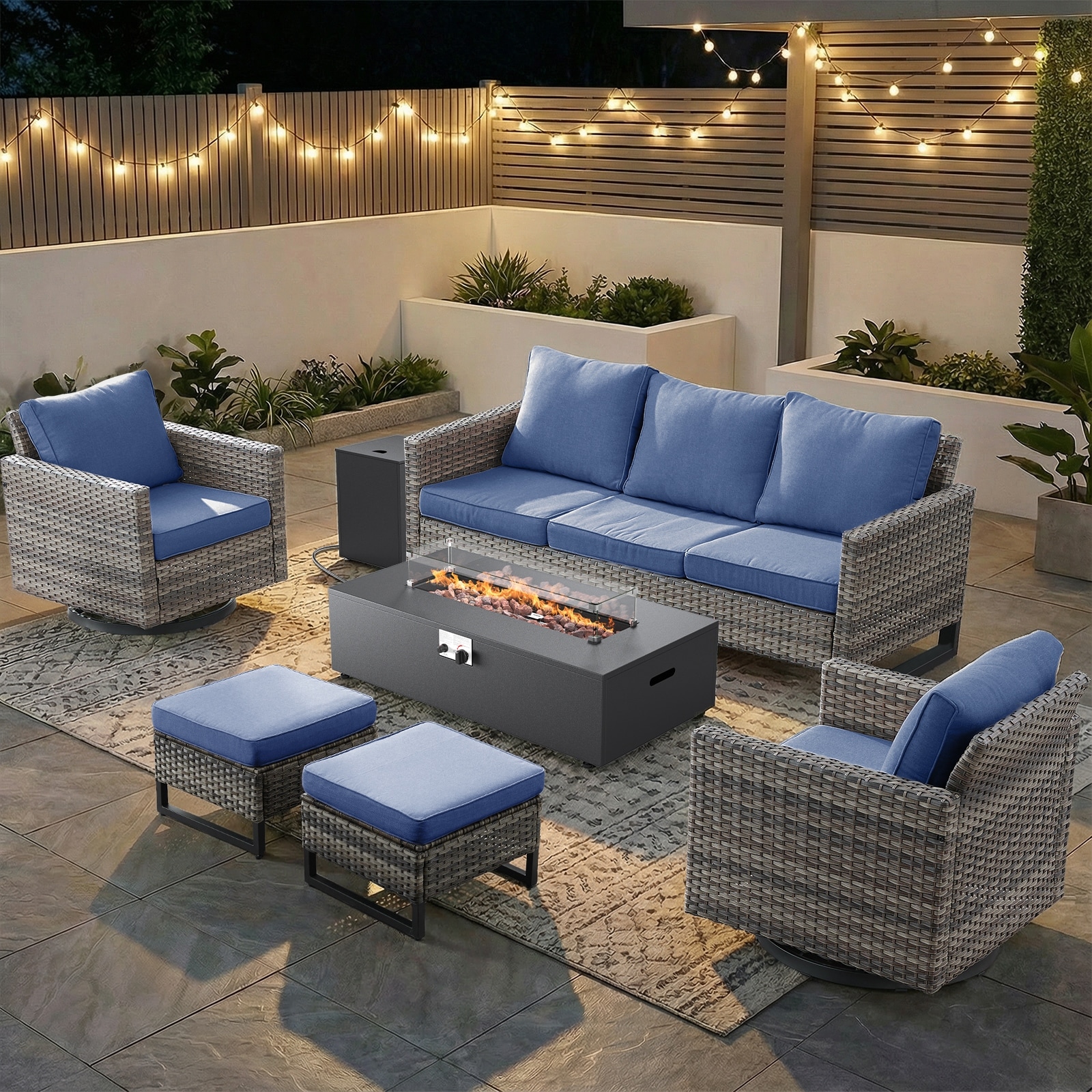Pocassy Patio 5/7PCS Sofa Swivel Chair Ottoman with Fire Pit Table
