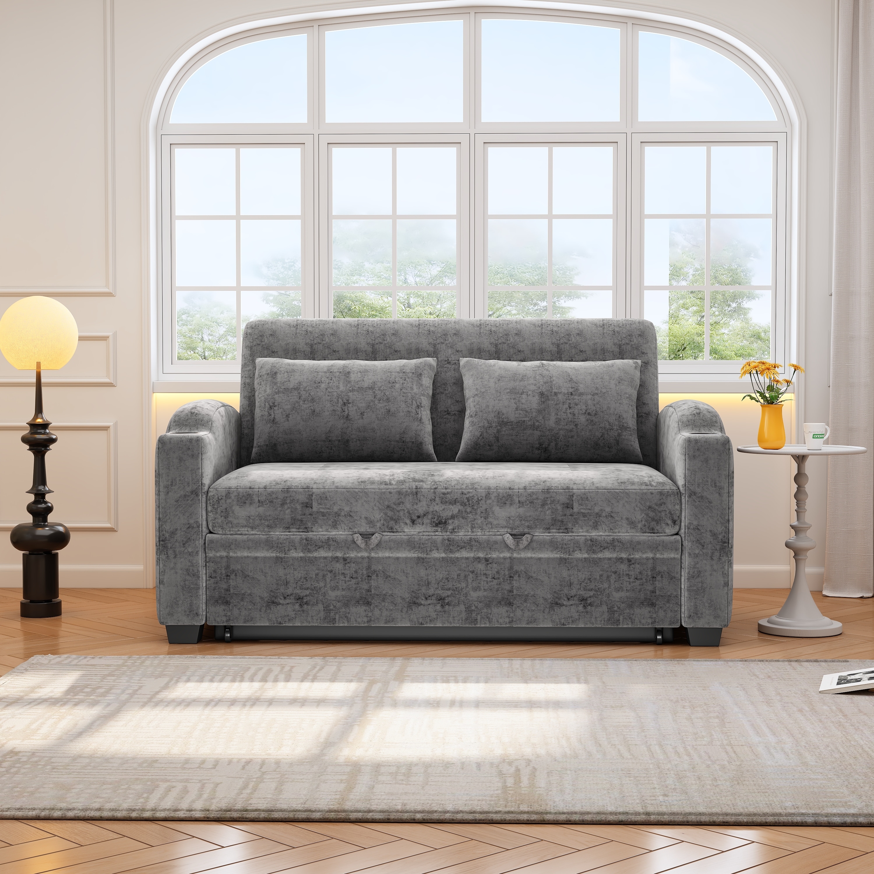 Roomfitters 61.6" Pull-Out Sofa Bed, Chenille Loveseat with Adjustable Backrest, Pillows, Cup Holders & USB Ports