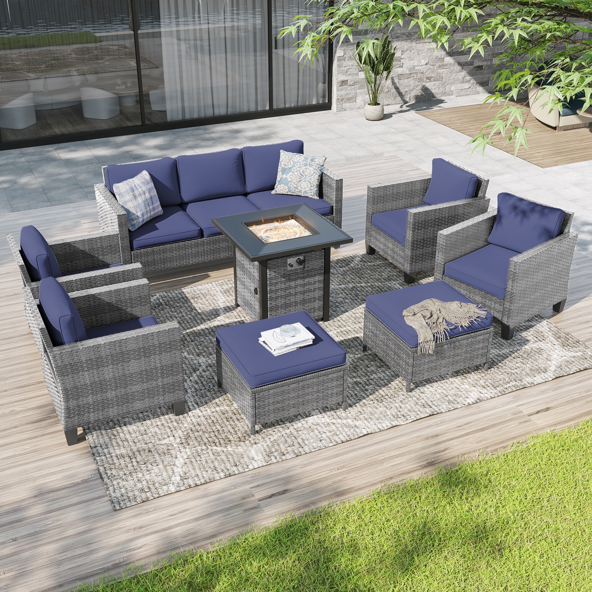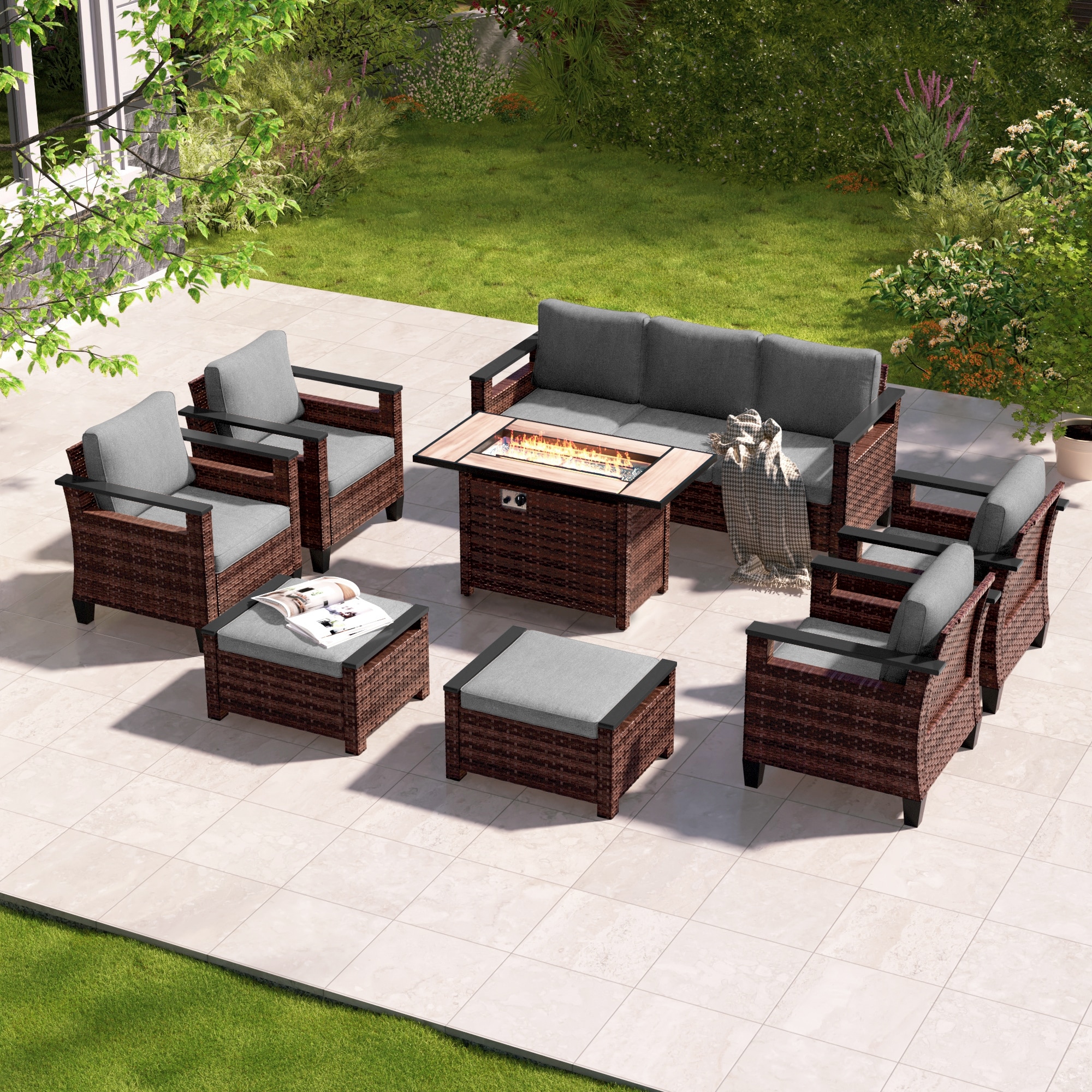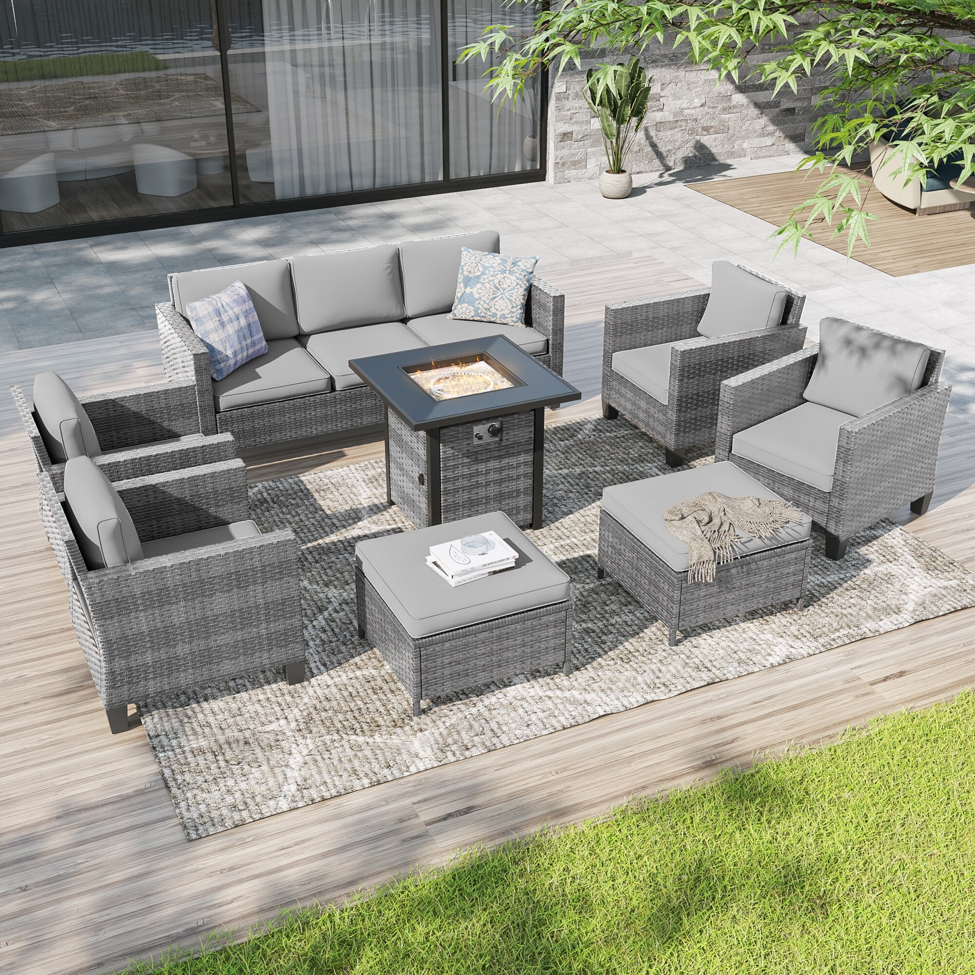 Livoosun 8 Pieces Patio Sofa with Rectangle Fire Pit Table and Ottomans, All-Weather PE Rattan Wicker Sofa with Cushion, Gray