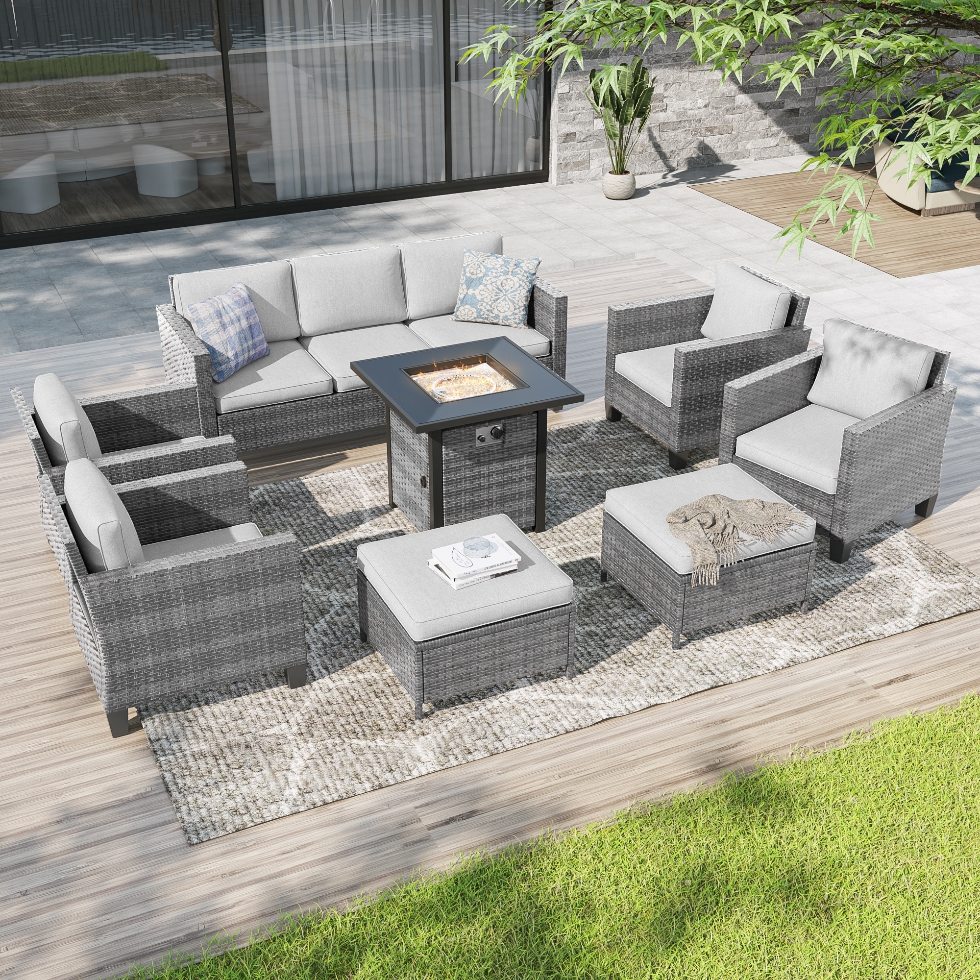 Livoosun 8 Pieces Patio Sofa with 28'' Fire Table Set, PE Wicker, Wide Armrests High Back Sofa Chair Design for Lawn, Patio