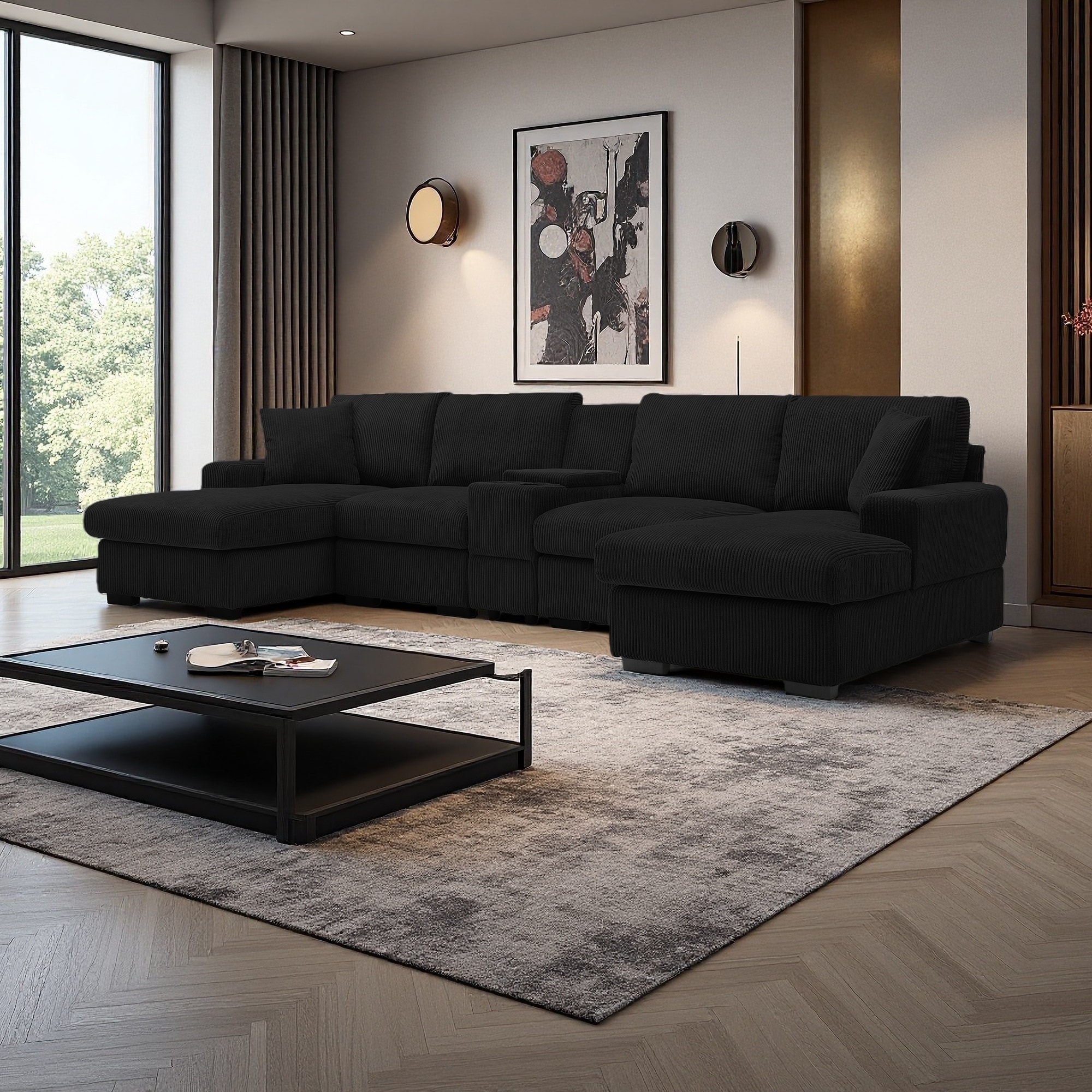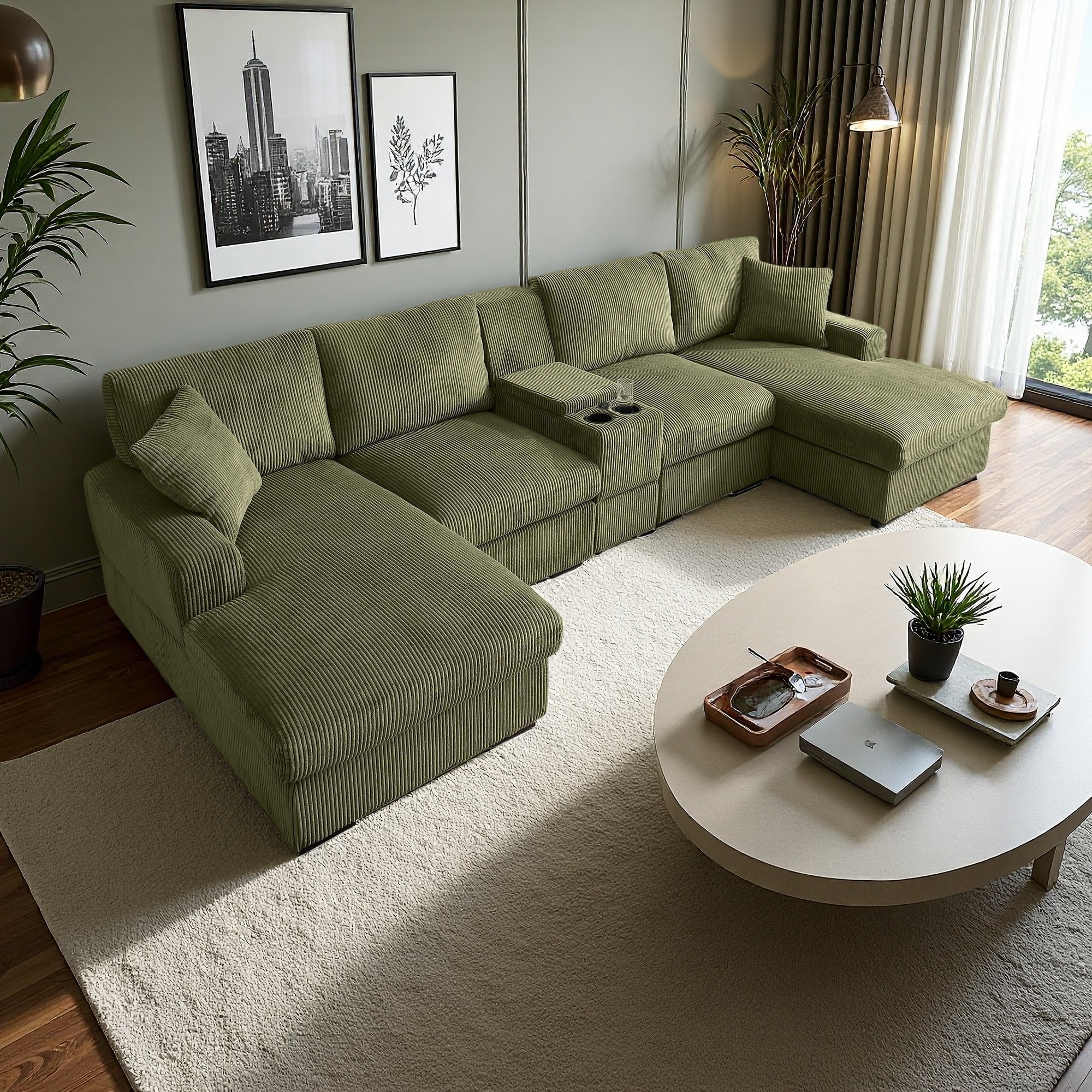 126" Corduroy U-Shaped Sectional Sofa with Console, Cup Holders & USB