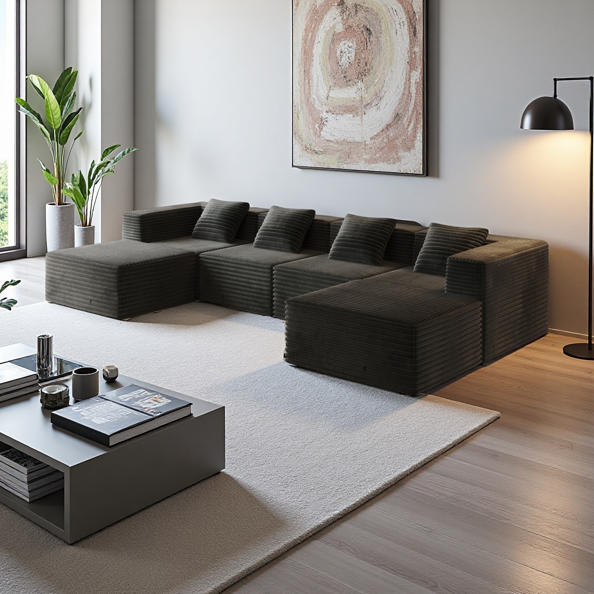 136" Corduroy Modular 4-Seater Sectional Sofa with 2 Ottomans, No Assembly