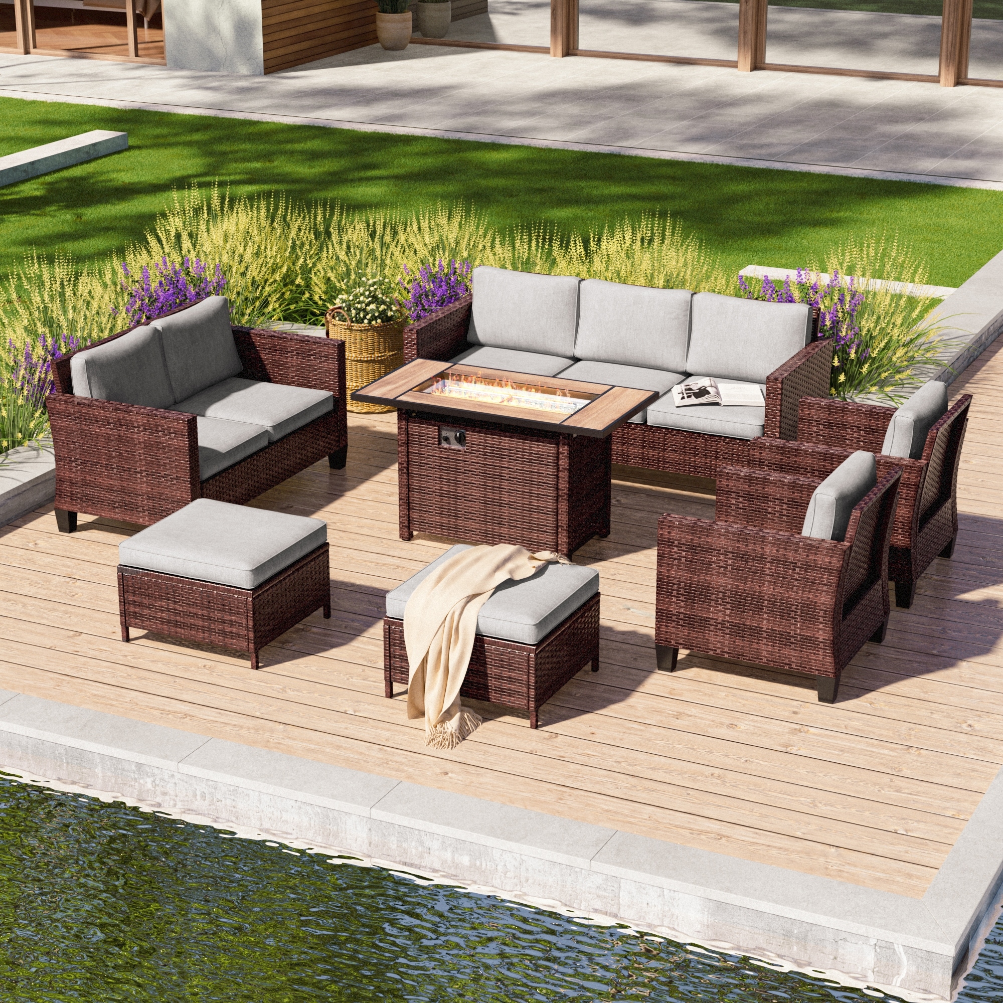Bonosuki 7 Pieces Patio Sofa with Rectangle Fire Pit Table and Ottomans, All-Weather PE Rattan Wicker Patio Sofa with Cushion