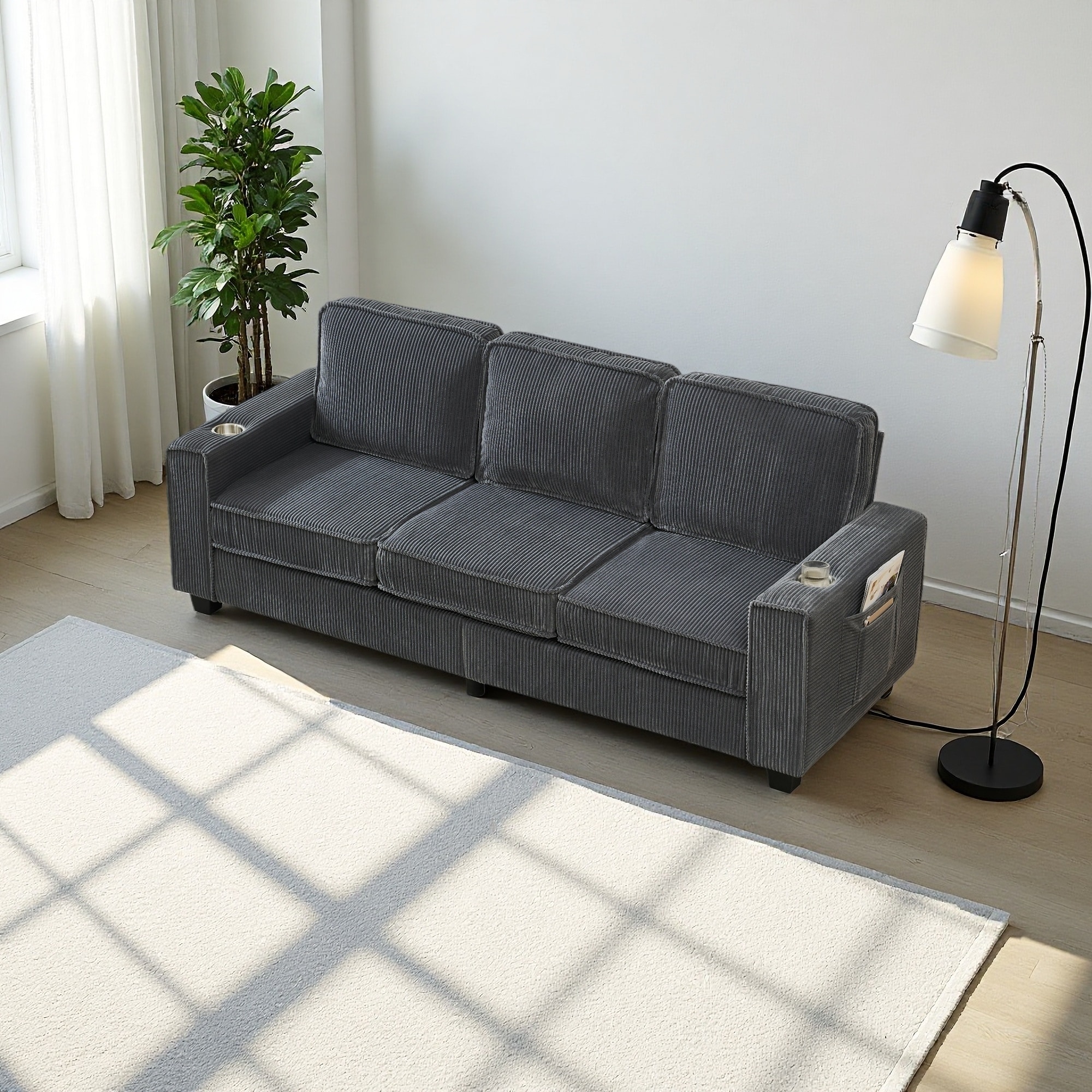 84.25" Corduroy Modern Compact Sofa with Cup Holders and Storage Pockets