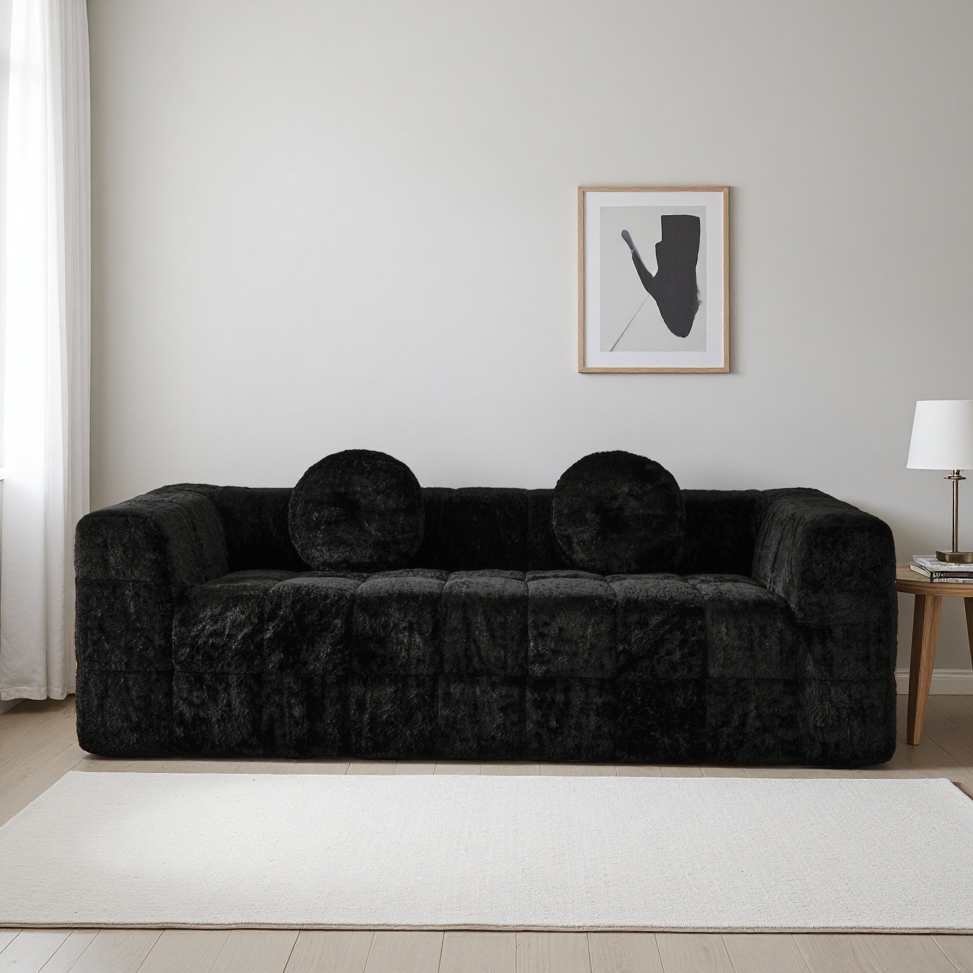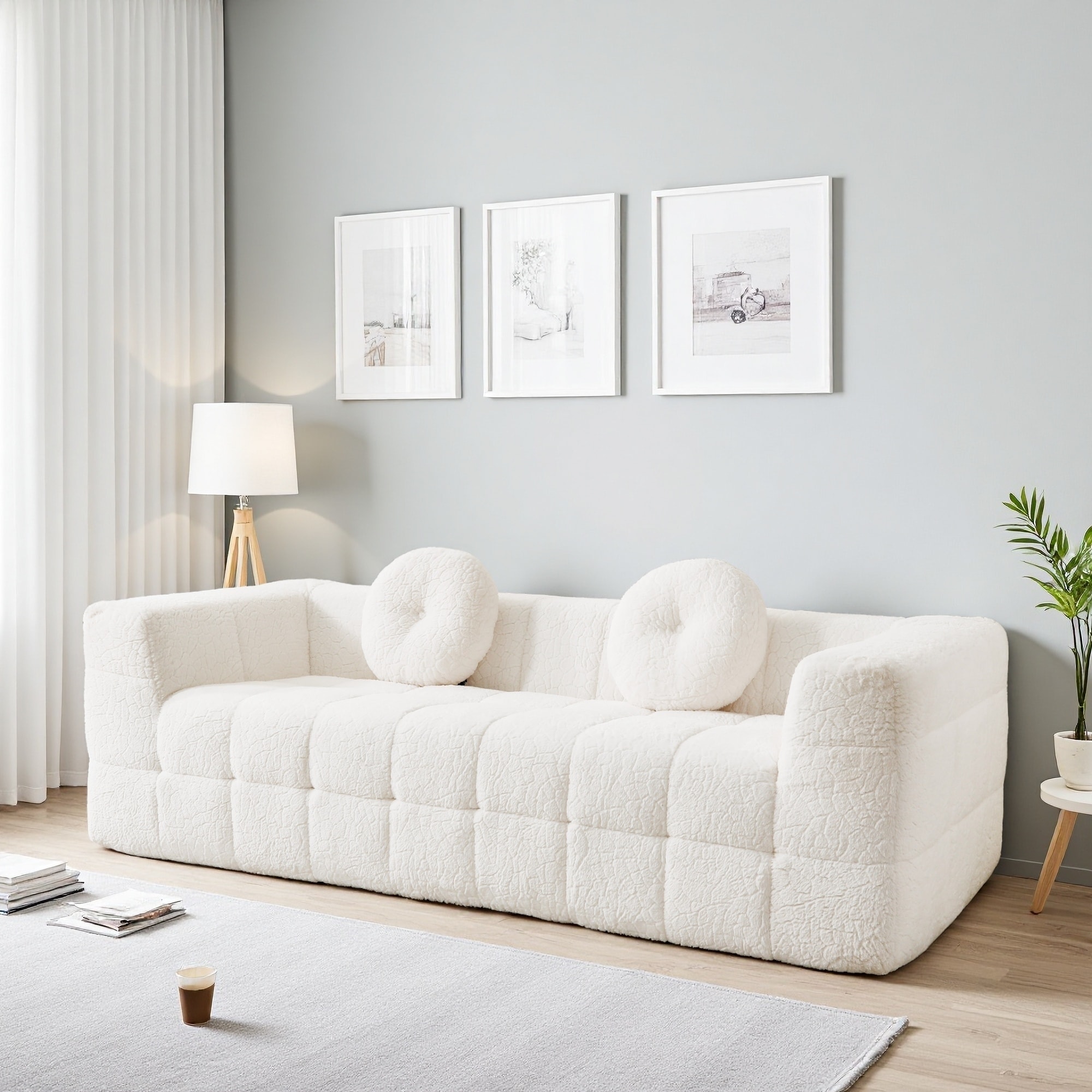 84.6" Polyester Modern Boneless Sofa with Checkered Fabric Design and 2 Circular Pillows (3-Seater)