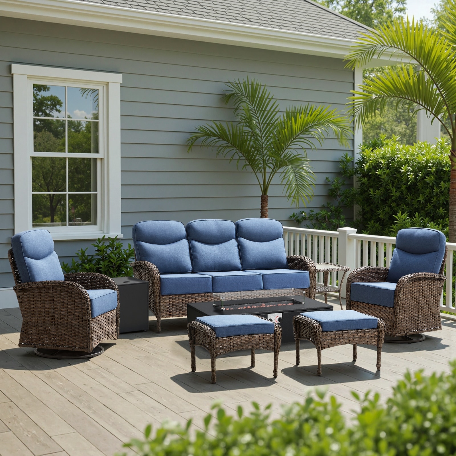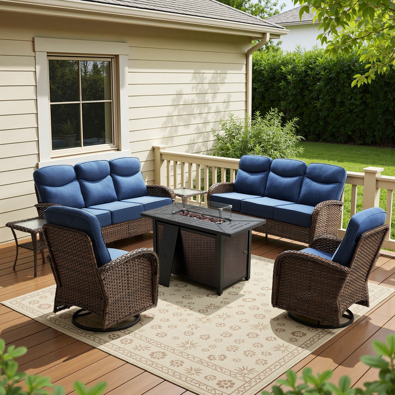 Gymojoy 7 - Person Fire Pit Outdoor Wicker Conversation Furniture Set with 6" Cushions, 55,000 BTU Propane Table