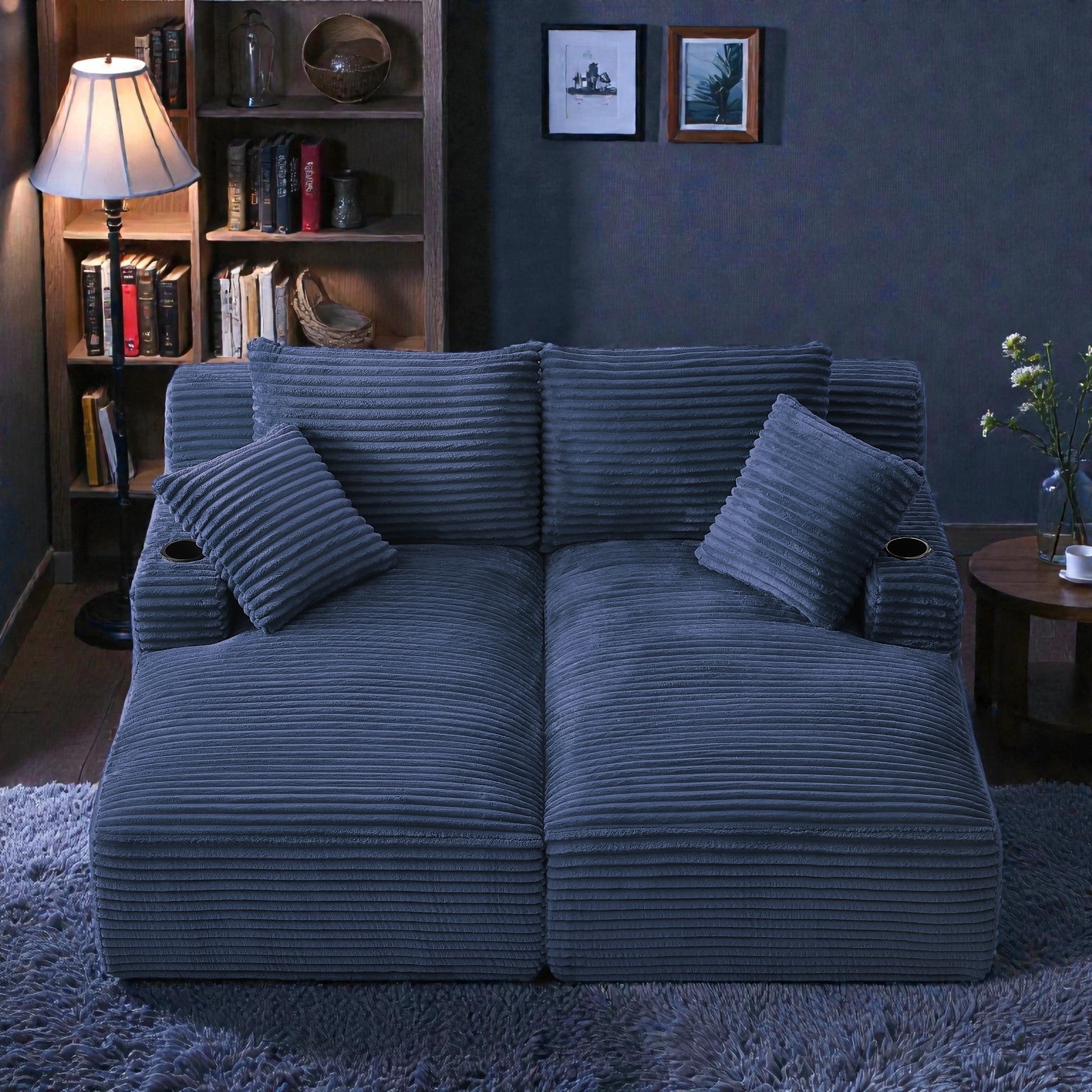 Double Chaise Lounge Loveseat with Cup Holders, Corduroy Upholstered Compressible Sleeper Sofa with Spring Padding