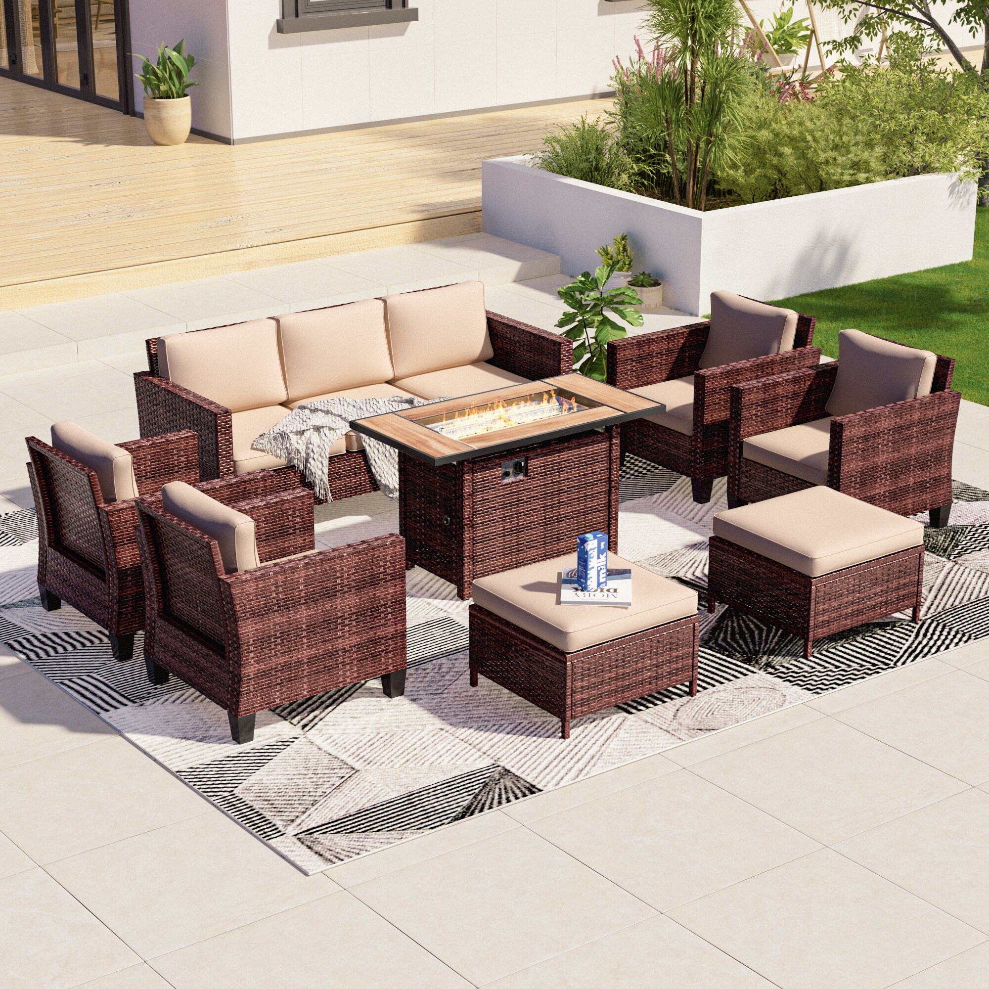 Bonosuki 8 Pieces Patio Sofa with Rectangle Fire Pit Table and Ottomans, All-Weather PE Rattan Wicker Patio Sofa with Cushion