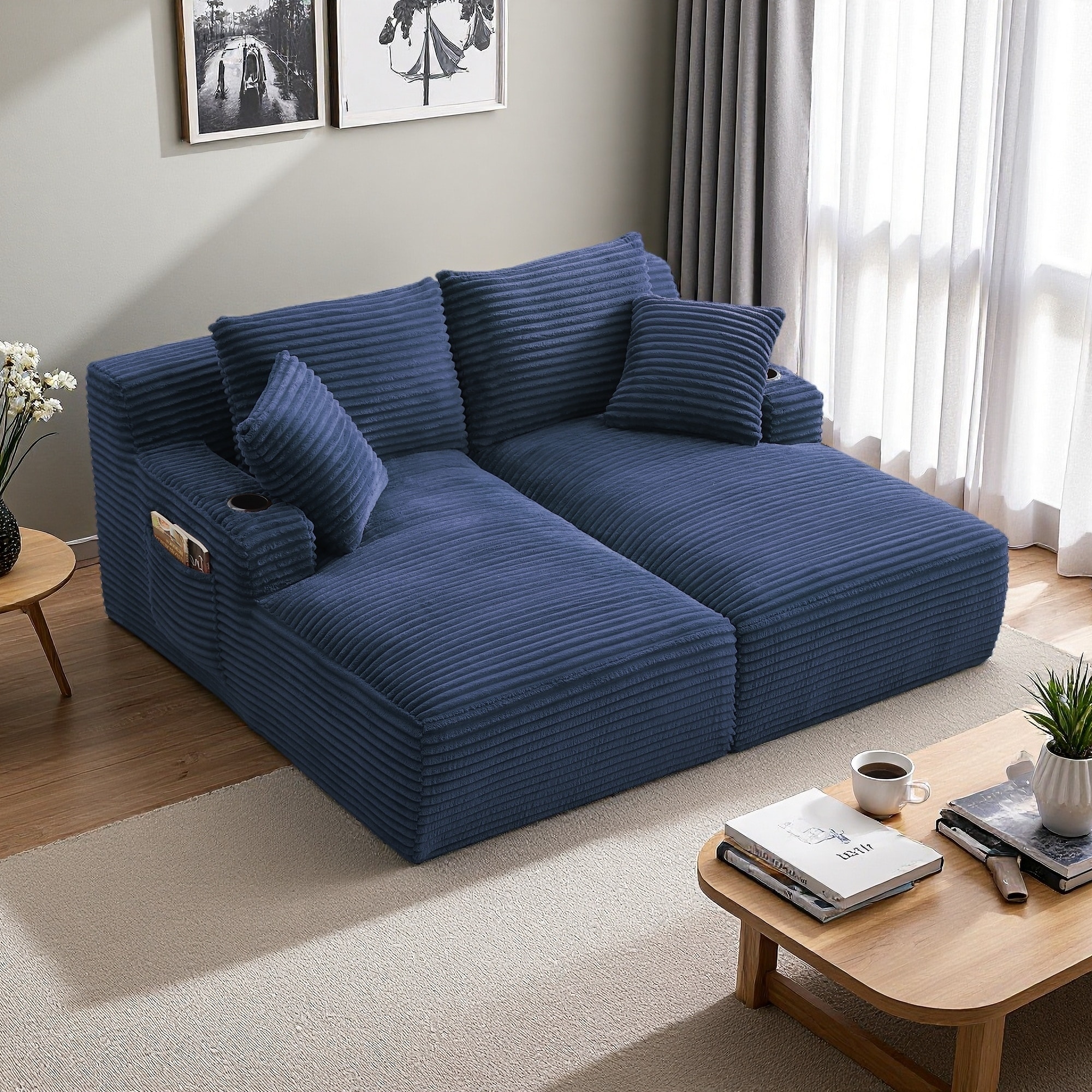 70.9" Corduroy Double Chaise Sectional Sofa with Cup Holders & Sleeper