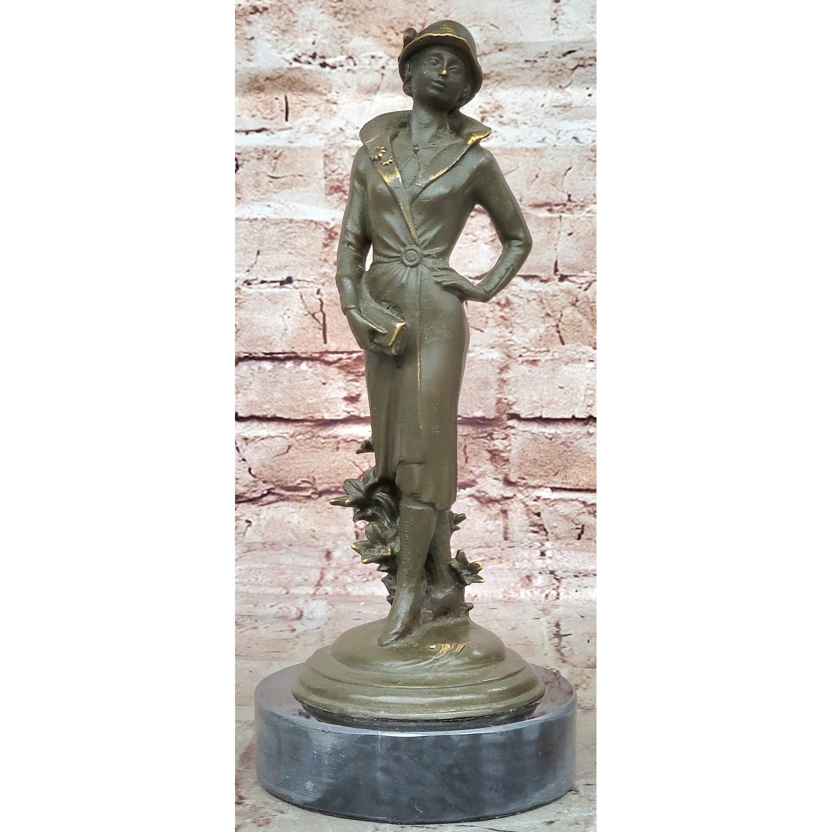 Elegant Art Deco Lady With Hat Bronze Sculpture On Marble Base