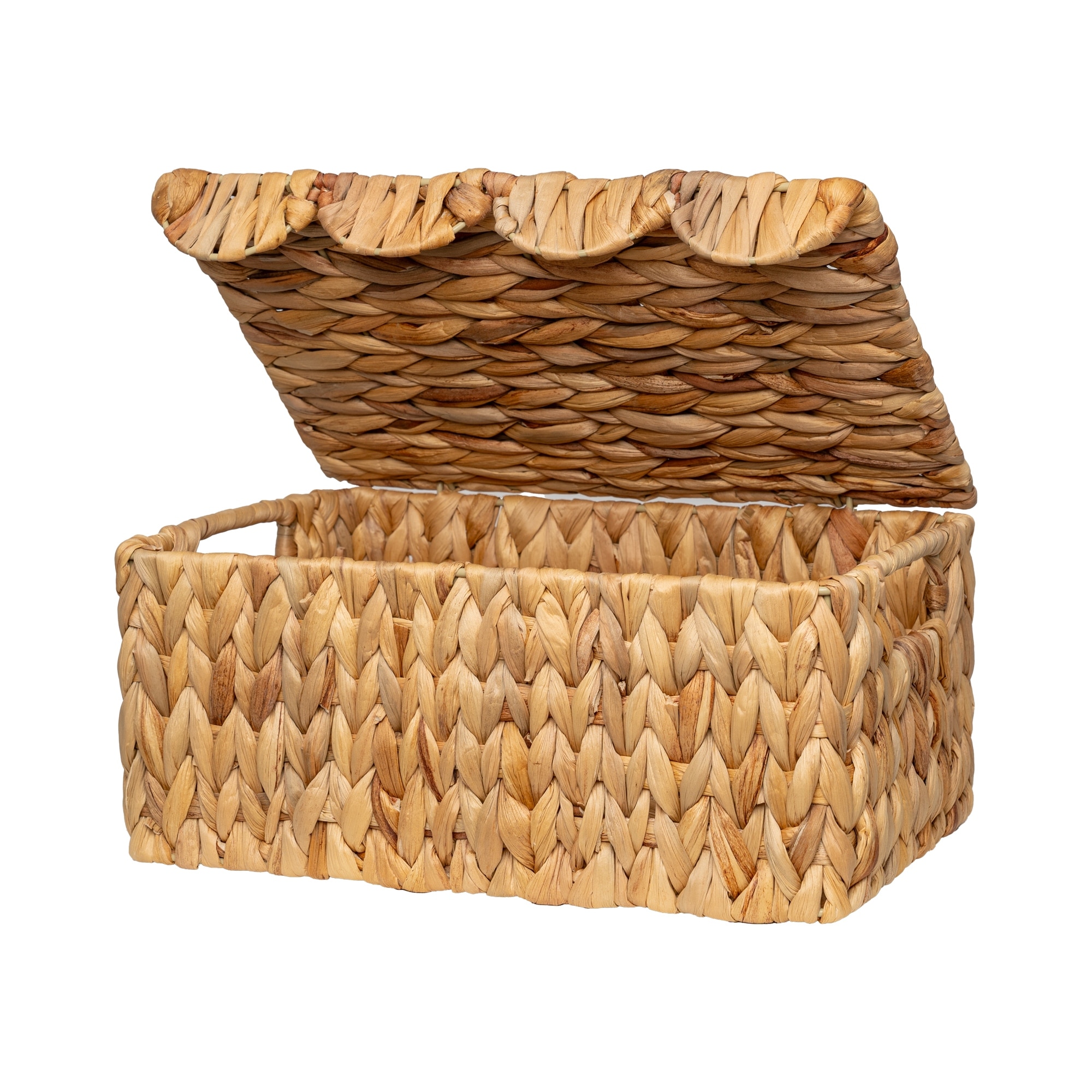 Rectangle Wicker Storage Basket with Scalloped Edge Lid, Handwoven Wicker Box with Built-in Handles